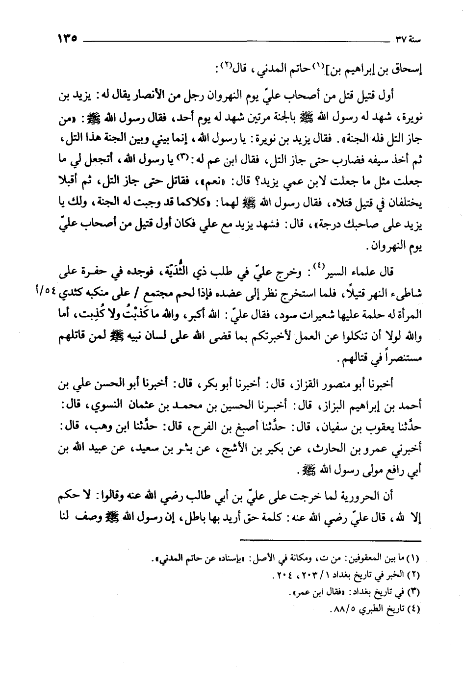 إِسْحَاقُ بْنُ إِبْرَاهِيمَ بْنِ] [1] حَاتِمٍ الْمَدَنِيُّ، قَالَ [2] : أَوَّلُ قَتِيلٍ قُتِلَ مِنْ أَصْحَابِ عَلِيٍّ يَوْمَ النَّهْرَوانِ رَجُلٌ مِنَ الأَنْصَارِ يُقَالُ لَهُ: يَزِيدُ بْنُ نُوَيْرَةَ، شَهِدَ لَهُ رَسُولُ اللَّهِ صَلَّى اللَّهُ عَلَيْهِ وَسَلَّمَ بِالْجَنَّةِ مَرَّتَيْنِ شَهِدَ لَهُ يَوْمَ أُحُدٍ، فَقَالَ رَسُولُ اللَّهِ صَلَّى اللَّهُ عَلَيْهِ وَسَلَّمَ: «مَنْ جَازَ التَّلَّ فَلَهُ الْجَنَّةُ» . فَقَالَ يَزِيدُ بْنُ نُوَيْرَةَ: يَا رَسُولَ اللَّهِ، إِنَّمَا بَيْنِي وَبَيْنَ الْجَنَّةِ هَذَا التَّلُّ، ثُمَّ أَخَذَ سَيْفَهُ فَضَارَبَ حَتَّى جَازَ التَّلَّ، فَقَالَ ابْنُ عَمٍّ لَهُ: [3] يَا رَسُولَ اللَّهِ، أَتَجْعَلُ لي ما جعلت مِثْلَ مَا جَعَلْتَ لابْنِ عَمِّي يَزِيدَ؟ قَالَ: «نَعَمْ» ، فَقَاتَلَ حَتَّى جَازَ التَّلَّ، ثُمَّ أَقْبَلا يَخْتَلِفَانِ فِي قَتِيلٍ قَتَلاهُ، فَقَالَ رَسُولُ اللَّهِ صَلَّى اللَّهُ عَلَيْهِ وَسَلَّمَ لَهُمَا: «كِلاكُمَا قَدْ وَجَبَتْ لَهُ الْجَنَّةُ، وَلَكَ يَا يَزِيدُ عَلَى صاحبك درجة» ، قال: فشهد يزيد مَعَ عَلِيٍّ فَكَانَ أَوَّلَ قَتِيلٍ مِنْ أَصْحَابِ عَلِيٍّ يَوْمَ النَّهْرَوَانِ. قَالَ علماء السير [4] : وخرج علي فِي طلب ذي الثدية، فوجده فِي حفرة على شاطئ النهر قتيلا، فلما استخرج نظر إلى عضده فإذا لحم مجتمع/ على منكبه كثدي 54/ أالمرأة له حلمة عليها شعيرات سود، فقَالَ علي: الله أكبر، والله ما كذبت ولا كذبت، أما والله لولا أن تنكلوا عن العمل لأخبرتكم بما قضى الله على لسان نبيه صَلَّى اللَّهُ عَلَيْهِ وَسَلَّمَ لمن قاتلهم مستنصرا فِي قتالهم. أَخْبَرَنَا أَبُو مَنْصُورٍ الْقَزَّازُ، قَالَ: أَخْبَرَنَا أَبُو بَكْرٍ، قَالَ: أَخْبَرَنَا أبو الحسن علي بن أحمد بن إِبْرَاهِيمَ الْبَزَّازُ، قَالَ: أَخْبَرَنَا الْحُسَيْنُ بْنُ مُحَمَّدِ بْنِ عُثْمَانَ النَّسَوِيُّ، قَالَ: