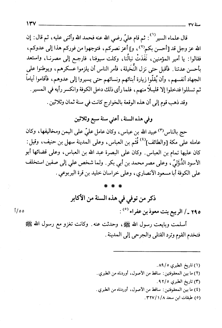 وفِي هذه السنة، أعني سنة سبع وثلاثين حج بالناس [3] عبيد الله بن عباس، وكان عامل علي على اليمن ومخاليفها، وكان عامله على مكة [والطائف] [4] قثم بن العباس، وعلى المدينة سهل بن حنيف، وقيل: