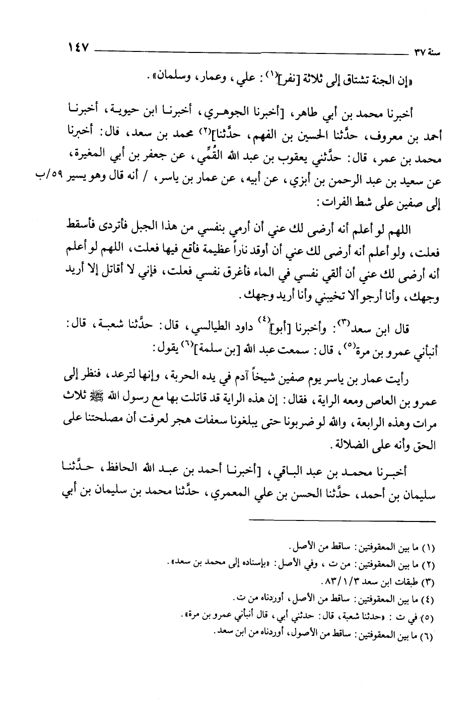 «إِنَّ الْجَنَّةَ تَشْتَاقُ إِلَى ثَلاثَةِ [نَفَرٍ] [1] : عَلِيٍّ، وَعَمَّارٍ، وَسَلْمَانَ» . أَخْبَرَنَا مُحَمَّدُ بْنُ أَبِي طَاهِرٍ، [أَخْبَرَنَا الْجَوْهَرِيُّ، أخبرنا ابن حيويه، أخبرنا أحمد بن معروف، حَدَّثَنَا الْحُسَيْنُ بْنُ الْفَهْمِ، حَدَّثَنَا] [2] مُحَمَّدُ بْنُ سعد، قال: أخبرنا محمد بن عمر، قال: حدّثني يعقوب بن عَبْدُ اللَّهِ الْقُمِّيُّ، عَنْ جَعْفَرِ بْنِ أَبِي الْمُغِيرَةِ، عَنْ سَعِيدِ بْنِ عَبْدِ الرَّحْمَنِ بْنِ أَبْزَى، عَنْ أَبِيهِ، عَنْ عَمَّارِ بْنِ يَاسِرٍ، / أنه قال وهو يسير 59/ ب إِلَى صِفِّينَ عَلَى شَطِّ الْفُرَاتِ: