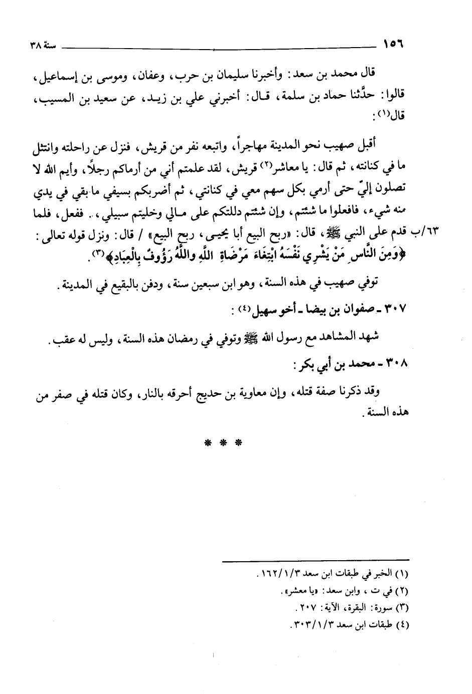 قَالَ مُحَمَّدُ بْنُ سَعْدٍ: وَأَخْبَرَنَا سُلَيْمَانُ بْنُ حَرْبٍ، وَعَفَّانُ، وَمُوسَى بْنُ إِسْمَاعِيلَ، قَالُوا: حَدَّثَنَا حَمَّادُ بْنُ سَلَمَةَ، قَالَ: أَخْبَرَنِي عَلِيُّ بْنُ زَيْدٍ، عَنْ سَعِيدِ بْنِ الْمُسَيِّبِ، قَالَ [1] : أَقْبَلَ صُهَيْبٌ نَحْوَ الْمَدِينَةِ مُهَاجِرًا، وَاتَّبَعَهُ نَفَرٌ مِنْ قُرَيْشٍ، فَنَزَلَ عَنْ رَاحِلَتِهِ وَانْتَثَلَ مَا فِي كِنَانَتِهِ، ثُمَّ قَالَ: يَا مَعَاشِرَ [2] قُرَيْشٍ، لَقَدْ عَلِمْتُمْ أَنِّي مِنْ أَرْمَاكُمْ رَجُلا، وَايْمُ اللَّهِ لا تَصِلُونَ إِلَيَّ حَتَّى أَرْمِيَ بِكُلِّ سَهْمٍ مَعِي فِي كِنَانَتِي، ثُمَّ أَضْرِبُكُمْ بِسَيْفِي مَا بَقِيَ فِي يَدِي مِنْهُ شَيْءٌ، فَافْعَلُوا مَا شِئْتُمْ، وَإِنْ شِئْتُمْ دَلَلْتُكُمْ عَلَى مَالِي وَخَلَّيْتُمْ سبيلي،. ففعل، فلما 63/ ب قَدِمَ عَلَى النَّبِيِّ صَلَّى اللَّهُ عَلَيْهِ وَسَلَّمَ، قَالَ: «رَبِحَ الْبَيْعُ أَبَا يَحْيَى، رَبِحَ الْبَيْعُ» / قَالَ: وَنَزَلَ قَوْلُهُ تَعَالَى: