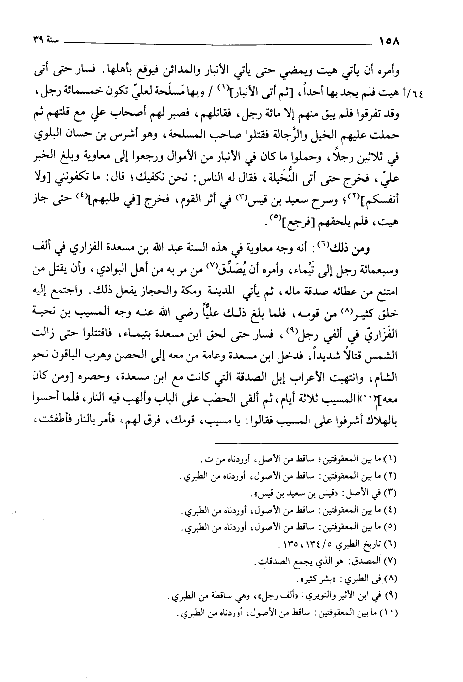 ومن ذلك [6] : أنه وجه معاوية فِي هذه السنة عَبْد الله بن مسعدة الفزاري في ألف وسبعمائة رجل إلى تيماء، وأمره أن يصدق [7] من مر به من أهل البوادي، وأن يقتل من امتنع من عطائه صدقة ماله، ثم يأتي المدينة ومكة والحجاز يفعل ذلك. واجتمع إليه خلق كثير [8] من قومه، فلما بلغ ذلك عليا رضي الله عنه وجه المسيب بن نجبة الفزاري فِي ألفِي رجل [9] ، فسار حتى لحق ابن مسعدة بتيماء، فاقتتلوا حتى زالت الشمس قتالا شديدا، فدخل ابن مسعدة وعامة من معه إلى الحصن وهرب الباقون نحو الشام، وانتهبت الأعراب إبل الصدقة التي كانت مع ابن مسعدة، وحصره [ومن كان معه] [10] المسيب ثلاثة أيام، ثم ألقى الحطب على الباب وألهب فيه النار، فلما أحسوا بالهلاك أشرفوا على المسيب فقالوا: يا مسيب، قومك، فرق لهم، فأمر بالنار فأطفئت،