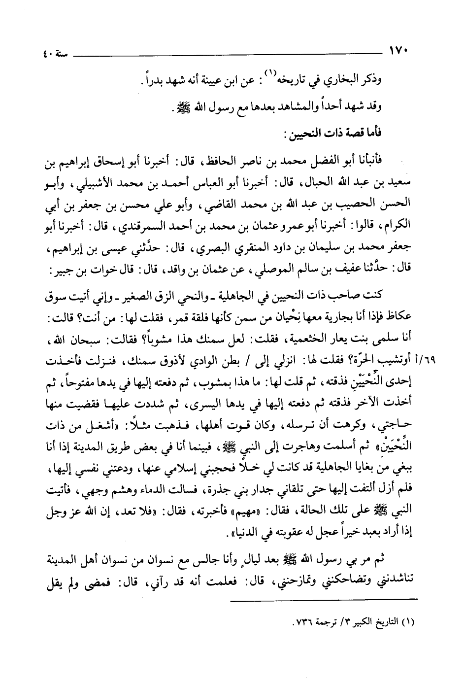 فَأَنْبَأَنَا أَبُو الْفَضْلِ مُحَمَّدُ بْنُ نَاصِرٍ الْحَافِظُ، قَالَ: أَخْبَرَنَا أبو إسحاق إبراهيم بن سعيد بن عبد الله الْحَبَّالِ، قَالَ: أَخْبَرَنَا أَبُو الْعَبَّاسِ أَحْمَدُ بْنُ مُحَمَّدٍ الإِشْبِيلِيُّ، وَأَبُو الْحَسَنِ الْحُصَيْبُ بْنُ عَبْدِ اللَّهِ بْنِ مُحَمَّدٍ الْقَاضِي، وَأَبُو عَلِيٍّ مُحَسِّنُ بْنُ جَعْفَرِ بْنِ أَبِي الْكِرَامِ، قَالُوا: أَخْبَرَنَا أَبُو عَمْرٍو عُثْمَانُ بْنُ مُحَمَّدِ بْنِ أَحْمَدَ السَّمَرْقَنْدِيُّ، قَالَ: أَخْبَرَنَا أَبُو جَعْفَرٍ مُحَمَّدُ بْنُ سُلَيْمَانَ بْنِ دَاوُدَ الْمِنْقَرِيُّ الْبَصْرِيُّ، قَالَ: حَدَّثَنِي عِيسَى بْنُ إِبْرَاهِيمَ، قَالَ: حَدَّثَنَا عَفِيفُ بْنُ سَالِمٍ الْمَوْصِلِيُّ، عَنْ عُثْمَانَ بْنِ وَاقِدٍ، قَالَ: قَالَ خَوَّاتُ بْنُ جُبَيْرٍ: كُنْتُ صَاحِبَ ذَاتِ النِّحْيَيْنِ فِي الْجَاهِلِيَّةِ- وَالنِّحْيُ الزِّقُّ الصَّغِيرُ- وَإِنِّي أتيت سوق عكاظ فإذا أنا بِجَارِيَةٍ مَعَهَا نِحْيَانِ مِنْ سَمْنٍ كَأَنَّهَا فَلْقَةُ قَمَرٍ، فَقُلْتُ لَهَا: مَنْ أَنْتِ؟ قَالَتْ: