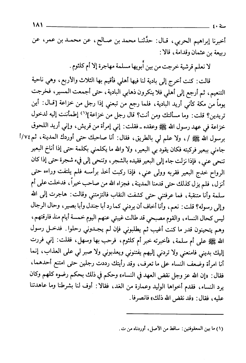 قَالَتْ: كُنْتُ أَخْرُجُ إِلَى بَادِيَةٍ لَنَا فِيهَا أَهْلِي فَأُقِيمُ بِهَا الثَّلاثَ وَالأَرْبَعَ، وَهِيَ نَاحِيَةَ التَّنْعِيمِ، ثُمَّ أَرْجِعُ إِلَى أَهْلِي فلا ينكرون ذِهَابِي الْبَادِيَةَ، حَتَّى أَجْمَعْتُ الْمَسِيرَ، فَخَرَجْتُ يَوْمًا مِنْ مَكَّةَ كَأَنِّي أُرِيدُ الْبَادِيَةَ، فَلَمَّا رَجَعَ مَنْ تَبِعَنِي إِذَا رَجُلٌ مِنْ خُزَاعَةَ [قَالَ: أَيْنَ تُرِيدِينَ؟ قُلْتُ: وَمَا مَسْأَلَتُكَ وَمَنْ أَنْتَ؟ قَالَ رَجُلٌ مِنْ خُزَاعَةَ] [1] اطْمَأْنَنْتُ إِلَيْهِ لِدُخُولِ خُزَاعَةَ فِي عَهْدِ رَسُولِ اللَّهِ صَلَّى اللَّهُ عَلَيْهِ وَسَلَّمَ وَعَقْدِهِ- فَقُلْتُ: إِنِّي امْرَأَةٌ مِنْ قُرَيْشٍ، وَإِنِّي أُرِيدُ اللُّحُوقَ بِرَسُولِ اللَّهِ صَلَّى اللَّهُ عَلَيْهِ وَسَلَّمَ/، وَلا عِلْمَ لِي بِالطَّرِيقِ، فَقَالَ: أَنَا صَاحِبُكِ حَتَّى أُورِدَكِ الْمَدِينَةَ، ثمَّ 74/ أجاءني بِبَعِيرٍ فَرَكِبْتُهُ فَكَانَ يَقُودُ بِي الْبَعِيرَ، وَلا وَاللَّهِ مَا يُكَلِّمُنِي بِكَلِمَةٍ حَتَّى إِذَا أَنَاخَ الْبَعِيرَ تَنَحَّى عَنِّي، فَإِذَا نَزَلْتُ جَاءَ إِلَى الْبَعِيرِ فَقَيَّدَهُ بِالشَّجَرِ، وَتَنَحَّى إِلَى فَيْءِ شَجَرَةٍ حَتَّى إِذَا كَانَ الرَّوَاحُ خَدَجَ الْبَعِيرَ فَقَرَّبَهُ وَوَلَّى عَنِّي، فَإِذَا رَكِبْتُ أَخَذَ بِرَأْسِهِ فَلَمْ يَلْتَفِتْ وَرَاءَهُ حَتَّى أَنْزِلَ، فَلَمْ يَزَلْ كَذَلِكَ حَتَّى قَدِمْنَا الْمَدِينَةَ، فَجَزَاهُ اللَّهُ مِنْ صَاحِبٍ خَيْرًا، فَدَخَلْتُ عَلَى أُمِّ سَلَمَةَ وَأَنَا مُتَنَقِّبَةٌ، فَمَا عَرَفَتْنِي حَتَّى كَشَفْتُ النِّقَابَ فَالْتَزَمَتْنِي وَقَالَتْ: هَاجَرْتِ إِلَى اللَّهِ وَإِلَى رَسُولِهِ؟ قُلْتُ: نَعَمْ، وَأَنَا أَخَافُ أَنْ يَرُدَّنِي كَمَا رَدَّ أَبَا جَنْدَلٍ وَأَبَا بَصِيرٍ، وَحَالُ الرِّجَالِ لَيْسَ كَحَالِ النِّسَاءِ، وَالْقَوْمُ مُصْبِحِي قَدْ طَالَتْ غَيْبَتِي عَنْهُمُ الْيَوْمَ خَمْسَةُ أَيَّامٍ مُنْذُ فَارَقْتُهُمْ، وَهُمْ يَتَحَيَّنُونَ قَدْرَ مَا كُنْتُ أَغِيبُ ثُمَّ يَطْلُبُونِي فَإِنْ لَمْ يَجِدُونِي رَحَلُوا. فَدَخَلَ رَسُولُ اللَّهِ صَلَّى اللَّهُ عَلَيْهِ وَسَلَّمَ عَلَى أُمِّ سَلَمَةَ، فَأَخْبَرَتْهُ خبر أم كلثوم، فرحب بها وسهل، فقلت: إِنِّي فَرَرْتُ إِلَيْكَ بِدِينِي فَامْنَعْنِي وَلا تَرُدَّنِي إِلَيْهِم يَفْتِنُونِي وَيُعَذِّبُونِي وَلا صَبْرَ لِي عَلَى الْعَذَابِ، إِنَّما أَنَا امْرَأَةٌ وَضَعْفُ النِّسَاءِ عَلَى مَا تَعْرِفُ، وَقَدْ رَأَيْتُكَ رَدَدْتَ رَجُلَيْنِ حَتَّى امْتَنَعَ أَحَدُهُمَا، فَقَالَ: «إِنَّ اللَّهَ عَزَّ وَجَلَّ نَقَضَ الْعَهْدَ فِي النِّسَاءِ» وَحَكَمَ فِي ذَلِكَ بِحُكْمِ رَضُوهُ كُلُّهُمْ وَكَانَ يَرُدُّ النِّسَاءَ، فَقَدِمَ أَخَوَاهَا الْوَلِيدُ وَعُمَارَةُ مِنَ الْغَدِ، فَقَالا: أَوْفِ لَنَا بِشَرْطِنَا وَمَا عَاهَدْتَنَا عَلَيْهِ، فَقَالَ: «قَدْ نقض الله ذلك» فانصرفا.