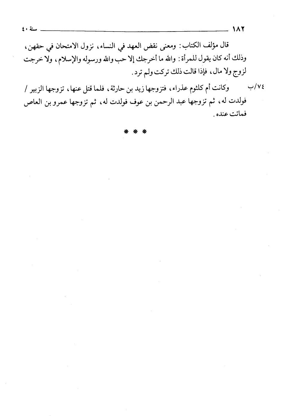 74/ ب وكانت أم كلثوم عذراء، فتزوجها زيد بن حارثة، فلما قتل عنها، تزوجها الزبير/ فولدت له، ثم تزوجها عَبْد الرَّحْمَنِ بن عوف فولدت له، ثم تزوجها عمرو بن العاص فماتت عنده
