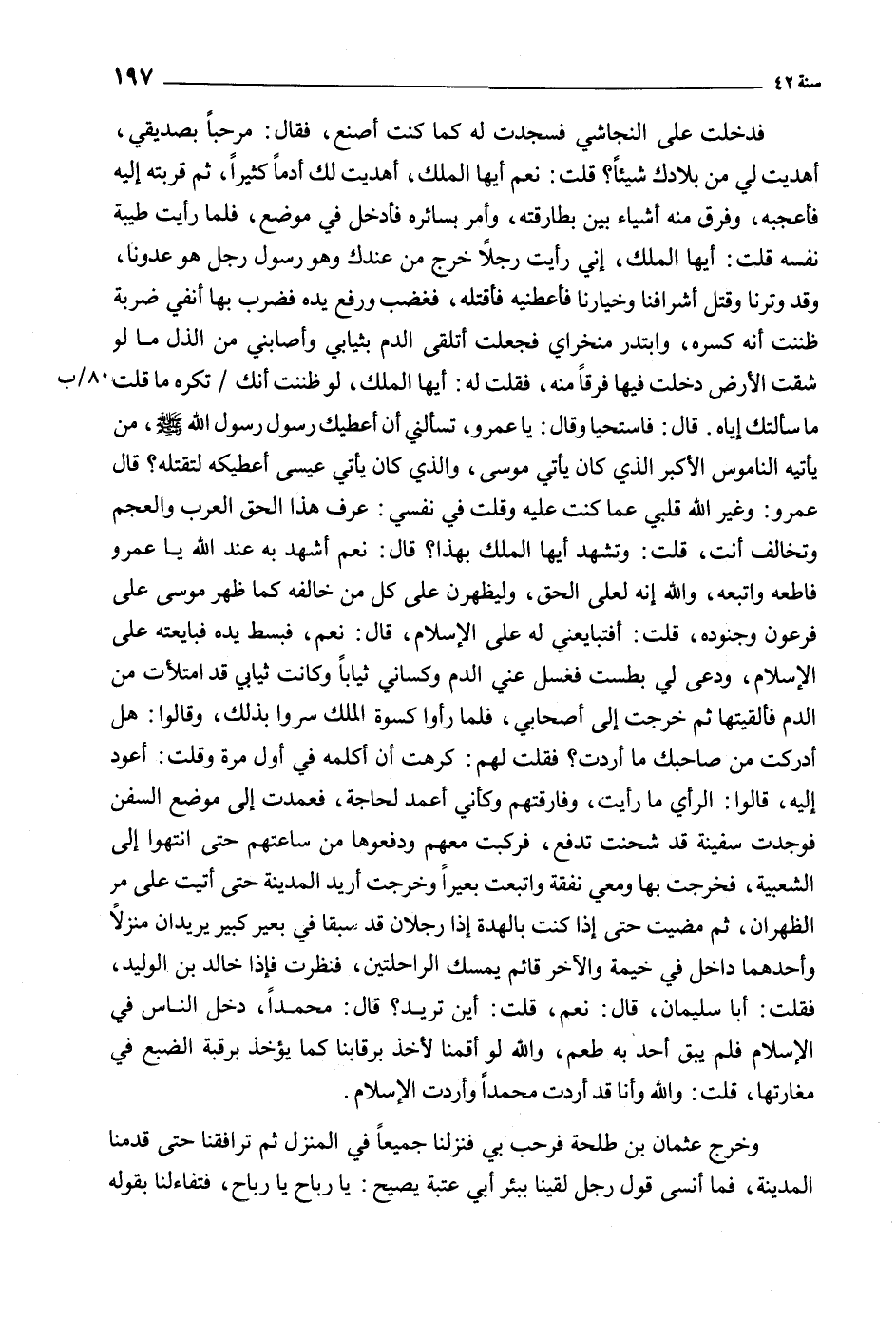 فَدَخَلْتُ عَلَى النَّجَاشِيِّ فَسَجَدْتُ لَهُ كَمَا كُنْتُ أَصْنَعُ، فَقَالَ: مَرْحَبًا بِصَدِيقِي، أَهْدَيْتَ لِي مِنْ بِلادِكَ شَيْئًا؟ قُلْتُ: نَعَمْ أَيُّهَا الْمَلِكُ، أَهْدَيْتُ لك أدما كثيرا، ثم قربته إليه فأعجبه، وفرق مِنْهُ أَشْيَاءَ بَيْنَ بَطَارِقَتِهِ، وَأَمَرَ بِسَائِرِهِ فَأُدْخِلَ في موضع، فلما رَأَيْتُ طِيبَةَ نَفْسِهِ قُلْتُ: أَيُّهَا الْمَلِكُ، إِنِّي رَأَيْتُ رَجُلا خَرَجَ مِنْ عِنْدِكَ وَهُوَ رَسُولُ رَجُلٍ هُوَ عَدُوُّنَا، وَقَدْ وَتَرَنَا وَقَتَلَ أَشْرَافَنَا وَخِيَارَنَا فَأَعْطِنِيهِ فَأَقْتُلُهُ، فَغَضِبَ وَرَفَعَ يَدَهُ فَضَرَبَ بِهَا أَنْفِي ضَرْبَةً ظَنَنْتُ أَنَّهُ كَسَرَهُ، وَابْتَدَرَ منخراي فجعلت أَتَلَقَّى الدَّمَ بِثِيَابِي وَأَصَابَنِي مِنَ الذُّلِّ مَا لَوْ شُقَّتِ الأَرْضُ دَخَلْتُ فِيهَا فَرَقًا مِنْهُ، فَقُلْتُ لَهُ: أَيُّهَا الْمَلِكُ، لَوْ ظَنَنْتُ أَنَّكَ/ تكره ما قلت 80/ ب مَا سَأَلْتُكَ إِيَّاهُ. قَالَ: فَاسْتَحْيَا وَقَالَ: يَا عمرو، تسألني أن أعطيك رسول الله صَلَّى اللهُ عَلَيْهِ وَسَلَّمَ، من يَأْتِيهِ النَّامُوسُ الأَكْبَرُ الَّذِي كَانَ يَأْتِي مُوسَى، وَالَّذِي كَانَ يَأْتِي عِيسَى أُعْطِيكَهُ لِتَقْتُلَهُ؟ قَالَ عَمْرٌو: وَغَيَّرَ اللَّهُ قَلْبِي عَمَّا كُنْتُ عَلَيْهِ وَقُلْتُ فِي نَفْسِي: عَرَفَ هَذَا الْحَقَّ الْعَرَبُ وَالْعَجَمُ وَتُخَالِفُ أَنْتَ، قُلْتُ: وَتَشْهَدُ أَيُّهَا الْمَلِكُ بِهَذَا؟ قَالَ: نَعَم أَشْهَدُ بِهِ عِنْدَ اللَّهِ يَا عَمْرُو فَأَطِعْهُ وَاتَّبِعْهُ، وَاللَّهِ إِنَّهُ لَعَلَى الْحَقِّ، وَلَيَظْهَرَنَّ عَلَى كُلِّ مَنْ خَالَفَهُ كَمَا ظَهَرَ مُوسَى عَلَى فِرْعَوْنَ وَجُنُودِهِ، قُلْتُ: أَفَتُبَايِعُنِي لَهُ عَلَى الإِسْلَامِ، قَالَ: نَعَمْ، فَبَسَطَ يَدَهُ فَبَايَعْتُهُ عَلَى الإِسْلامِ، وَدَعَى لِي بِطِسْتٍ فَغَسَلَ عَنِّي الدَّمَ وَكَسَانِي ثِيَابًا وَكَانَتْ ثِيَابِي قَدِ امْتَلَأَتْ مِنَ الدَّمِ فَأَلْقَيْتُهَا ثُمَّ خَرَجْتُ إِلَى أصحابي، فلما رأوا كِسْوَةَ الْمَلِكِ سُرُّوا بِذَلِكَ، وَقَالُوا: هَلْ أَدْرَكْتَ مِنْ صَاحِبِكَ مَا أَرَدْتَ؟ فَقُلْتُ لَهُمْ: كَرِهْتُ أَنْ أُكَلِّمَهُ فِي أَوَّلِ مَرَّةٍ وَقُلْتُ: أَعُودُ إِلَيْهِ، قَالُوا: الرَّأْيُ مَا رَأَيْتَ، وَفَارَقْتُهُمْ وَكَأَنِّي أَعْمَدُ لِحَاجَةٍ، فَعَمَدْتُ إِلَى مَوْضِعِ السُّفُنِ فَوَجَدْتُ سَفِينَةً قَدْ شُحِنَتَ تَدْفَعُ، فَرَكِبْتُ مَعَهُمْ وَدَفَعُوهَا مِنْ سَاعَتِهِمْ حَتَّى انْتَهَوْا إِلَى الشَّعْبِيَّةِ، فَخَرَجْتُ بها ومعي نفقة واتبعت بَعِيرًا وَخَرَجْتُ أُرِيدُ الْمَدِينَةَ حَتَّى أَتَيْتُ عَلَى مر الظهران، ثم مضيت حتى إِذَا كُنْتُ بِالْهَدَّةَ إِذَا رَجُلانِ قَدْ سَبَقَا فِي بَعِيرٍ كَبِيرٍ يُرِيدَانِ مَنْزِلا وَأَحَدُهُمَا دَاخِلٌ فِي خَيْمَةٍ وَالآخَرُ قَائِمٌ يَمْسِكُ الرَّاحِلَتَيْنِ، فَنَظَرْتُ فَإِذَا خَالِدُ بْنُ الْوَلِيدِ، فَقُلْتُ: أَبَا سُلَيْمَانَ، قَالَ: نَعَمْ، قُلْتُ: أَيْنَ تُرِيدُ؟ قَالَ: مُحَمَّدًا، دَخَلَ النَّاسُ فِي الإِسْلامِ فَلَمْ يَبْقَ أَحَدٌ بِهِ طُعْمٌ، وَاللَّهِ لَوْ أَقَمْنَا لأَخَذَ بِرِقَابِنَا كَمَا يُؤْخَذُ بِرَقَبَةِ الضَّبُعِ فِي مَغَارَتِهَا، قُلْتُ: وَاللَّهِ وَأَنَا قَدْ أَرَدْتُ مُحَمَّدًا وَأَرَدْتُ الإِسْلامَ.