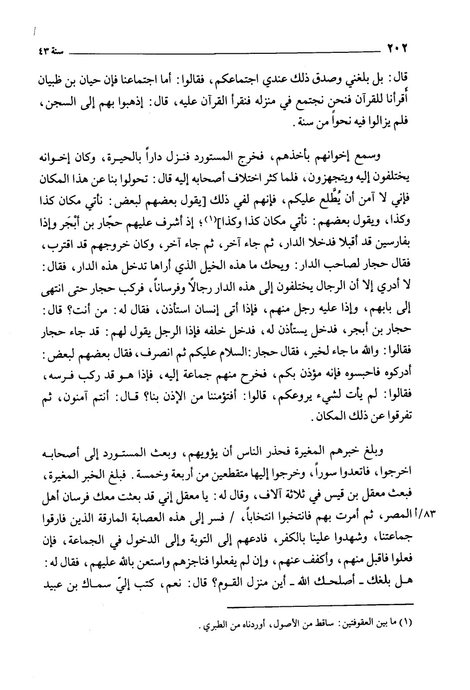 وسمع إخوانهم بأخذهم، فخرج المستورد فنزل دارا بالحيرة، وكان إخوانه يختلفون إليه ويتجهزون، فلما كثر اختلاف أصحابه إليه قَالَ: تحولوا بنا عن هذا المكان فإني لا آمن أن يطلع عليكم، فإنهم لفِي ذلك [يقول بعضهم لبعض: نأتي مكان كذا وكذا، ويقول بعضهم: نأتي مكان كذا وكذا] [1] ، إذ أشرف عليهم حجار بن أبجر وإذا بفارسين قد أقبلا فدخلا الدار، ثم جاء آخر، ثم جاء آخر، وكان خروجهم قد اقترب، فقَالَ حجار لصاحب الدار: ويحك ما هذه الخيل الذي أراها تدخل هذه الدار، فقَالَ: