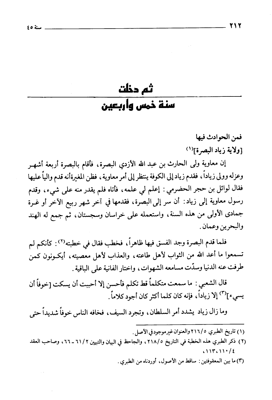 [2] ذكر الطبري هذه الخطبة في التاريخ 5/ 218، والجاحظ في البيان والتبيين 2/ 61- 66، وصاحب العقد 4/ 110، 113،