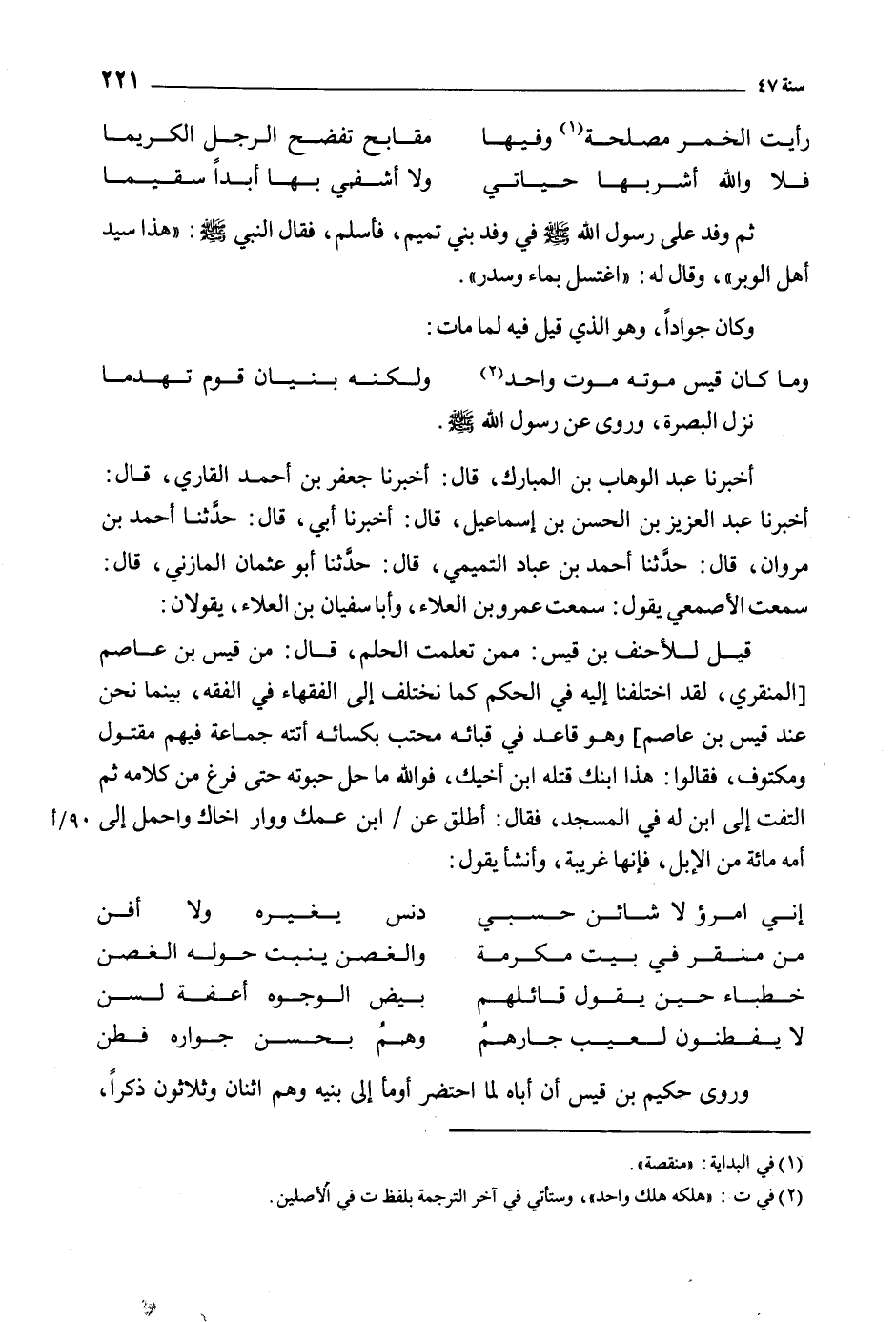 قيل للأحنف بن قيس: ممن تعلمت الحلم، قَالَ: من قيس بن عاصم [المنقري، لقد اختلفنا إليه فِي الحكم كما نختلف إلى الفقهاء فِي الفقه، بينما نحن عند قيس بن عاصم] وهو قاعد فِي قبائه محتب بكسائه أتته جماعة فيهم مقتول ومكتوف، فقالوا: هذا ابنك قتله ابن أخيك، فو الله ما حل حبوته حتى فرغ من كلامه ثم التفت إلى ابن له فِي المسجد، فقَالَ: أطلق عن/ ابن عمك ووار أخاك واحمل إلى 90/ أأمه مائة من الإبل، فإنها غريبة، وأنشأ يقول: