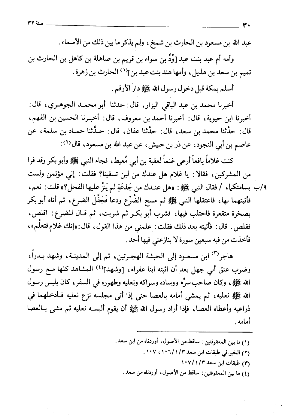 أَخْبَرَنَا ابن حيوية، قال: أخبرنا أحمد بن معروف، قال: أخبرنا الحسين بن الفهم، قال: حدثنا محمد بن سعد، قال: حدثنا عَفَّانُ، قَالَ: حَدَّثَنَا حَمَّادُ بْنُ سَلَمَةَ، عَنْ عَاصِمِ بْنِ أَبِي النُّجُودِ، عَنْ ذر بْنِ حُبَيْشٍ، عَنْ عَبْدِ اللَّهِ بْنِ مَسْعُودٍ، قَالَ [2] : كُنْتُ غُلامًا يَافِعًا أَرْعَى غَنَمًا لِعُقْبَةَ بن أبي معيط، فجاء النَّبِي صَلَّى اللَّهُ عَلَيْهِ وَسَلَّمَ وَأَبُو بَكْر وَقَدْ فَرَّا مِنَ الْمُشْرِكِينَ، فَقَالا: يَا غُلامُ هَلْ عِنْدَكَ مِنْ لَبَنٍ تَسْقِينَا؟ فقلت: إني مؤتمن ولست 9/ ب بسامتكما، / فَقَالَ النَّبِيُّ صَلَّى اللَّهُ عَلَيْهِ وَسَلَّمَ: «هَلْ عِنْدَكَ مِنْ جَذْعَةٍ لَمْ يَنْزُ عَلَيْهَا الْفَحْلُ؟» قُلْتُ: نَعَمْ، فَأَتَيْتُهُمَا بِهَا، فَاعْتَقَلَهَا النَّبِيُّ صَلَّى اللَّهُ عَلَيْهِ وَسَلَّمَ ثُمَّ مَسَحَ الضَّرْعَ وَدَعَا فَجَفَّلَ الضَّرْعُ، ثُمَّ أَتَاهُ أَبُو بَكْرٍ بِصَخْرَةٍ مُتَقَعِّرَةٍ فَاحْتَلَبَ فِيهَا، فَشَرِبَ أَبُو بَكْرٍ ثُمَّ شَرِبْتُ، ثُمَّ قَالَ لِلضَّرْعِ: اقْلِصْ، فَقَلَصَ. قَالَ: فَأَتَيْتُهُ بَعْدَ ذَلِكَ فَقُلْتُ: عَلِّمْنِي مِنْ هَذَا الْقَوْلِ، قَالَ: «إِنَّكَ غُلامٌ فَتَعَلَّمْ» ، فَأَخَذْتُ مِنْ فِيهِ سَبْعِينَ سُورَةً لا يُنَازِعُنِي فِيهَا أَحَدٌ. هاجر [3] ابن مسعود إلى الحبشة الهجرتين، ثم إلى المدينة، وشهد بدرا، وضرب عنق أبي جهل بعد أن أثبته ابنا عفراء، [وشهد] [4] المشاهد كلها مع رسول الله صَلَّى اللَّهُ عَلَيْهِ وَسَلَّمَ، وكان صاحب سره ووساده وسواكه ونعليه وطهوره فِي السفر، كان يلبس رسول الله صَلَّى اللَّهُ عَلَيْهِ وَسَلَّمَ نعليه، ثم يمشي أمامه بالعصا حتى إذا أتى مجلسه نزع نعليه فأدخلهما فِي ذراعيه وأعطاه العصا، فإذا أراد رَسُولُ اللَّهِ صَلَّى اللَّهُ عَلَيْهِ وَسَلَّمَ إِنَّ يقوم ألبسه نعليه ثم مشى بالعصا أمامه.