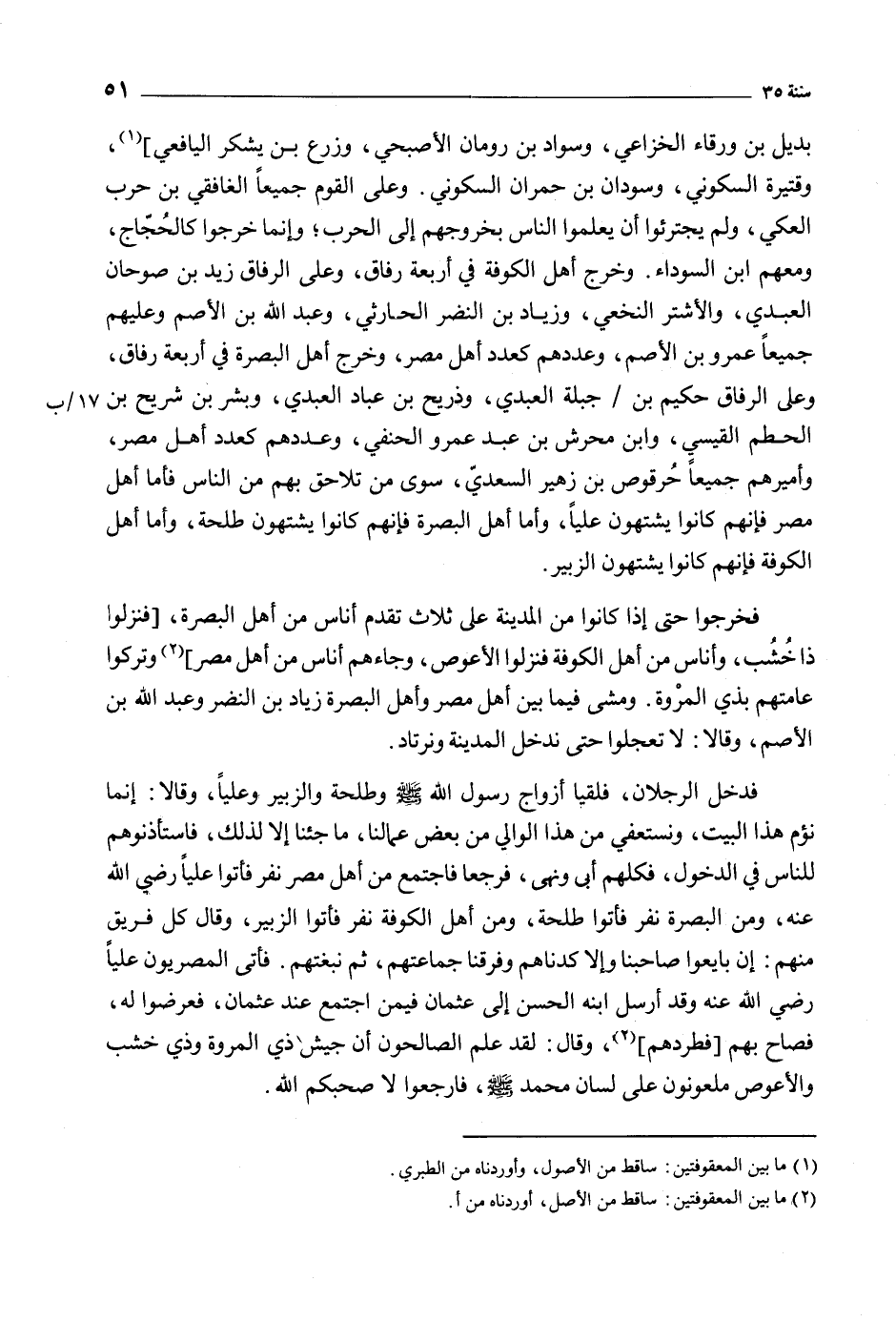 بديل بن ورقاء الخزاعي، وسواد بن رومان الأصبحي، وزرع بن يشكر اليافعي] [1] ، وقتيرة السكوني، وسودان بن حمران السكوني. وعلى القوم جميعا الغافقي بن حرب العكي، ولم يجترئوا أن يعلموا الناس بخروجهم إلى الحرب، وإنما خرجوا كالحجاج، ومعهم ابن السوداء. وخرج أهل الكوفة فِي أربعة رفاق، وعلى الرفاق زيد بن صوحان العبدي، والأشتر النخعي، وزياد بن النضر الحارثي، وعَبْد اللَّهِ بن الأصم وعليهم جميعا عمرو بن الأصم، وعددهم كعدد أهل مصر، وخرج أهل البصرة فِي أربعة رفاق، وعلى الرفاق حكيم بن/ جبلة العبدي، وذريح بن عباد العبدي، وبشر بن شريح بن 17/ ب الحطم القيسي، وابن محرش بن عبد عمرو الحنفِي، وعددهم كعدد أهل مصر، وأميرهم جميعا حرقوص بن زهير السعدي، سوى من تلاحق بهم من الناس فأما أهل مصر فإنهم كانوا يشتهون عليا، وأما أهل البصرة فإنهم كانوا يشتهون طَلْحَة، وأما أهل الكوفة فإنهم كانوا يشتهون الزبير.