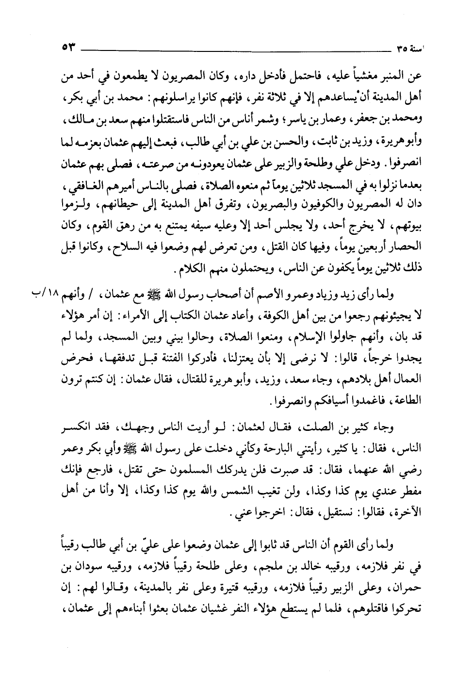 عن المنبر مغشيا عليه، فاحتمل فأدخل داره، وكان المصريون لا يطمعون فِي أحد من أهل المدينة أن يساعدهم إلا فِي ثلاثة نفر، فإنهم كانوا يراسلونهم: مُحَمَّد بن أبي بكر، ومُحَمَّد بن جعفر، وعمار بن ياسر، وشمر أناس من الناس فاستقتلوا منهم سعد بن مالك، وأبو هريرة، وزيد بن ثابت، والحسن بن علي بن أبي طالب، فبعث إليهم عثمان بعزمه لما انصرفوا. ودخل علي وطَلْحَة والزبير على عثمان يعودونه من صرعته، فصلى بهم عثمان بعد ما نزلوا به فِي المسجد ثلاثين يوما ثم منعوه الصلاة، فصلى بالناس أميرهم الغافقي، دان له المصريون والكوفيون والبصريون، وتفرق أهل المدينة إلى حيطانهم، ولزموا بيوتهم، لا يخرج أحد، ولا يجلس أحد إلا وعليه سيفه يمتنع به من رهق القوم، وكان الحصار أربعين يوما، وفيها كان القتل، ومن تعرض لهم وضعوا فيه السلاح، وكانوا قبل ذلك ثلاثين يوما يكفون عن الناس، ويحتملون منهم الكلام.