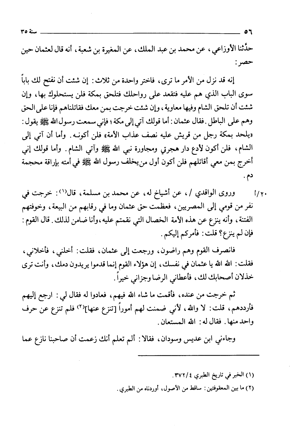 20/ أوروى الواقدي/، عن أشياخ له، عن مُحَمَّد بن مسلمة، قَالَ [1] : خرجت فِي نفر من قومي إلى المصريين، فعظمت حق عثمان وما فِي رقابهم من البيعة، وخوفتهم الفتنة، وأنه ينزع عن هذه الأمة الخصال التي نقمتم عليه، وأنا ضامن لذلك. قَالَ القوم: