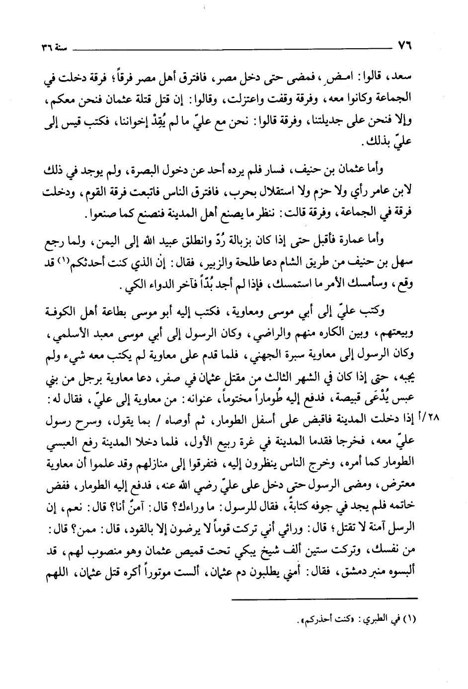 سَعْدٍ، قَالُوا: امْضِ، فَمَضَى حَتَّى دَخَلَ مِصْرَ، فَافْتَرَقَ أَهْلُ مِصْرَ فِرَقًا، فِرْقَةٌ دَخَلَتْ فِي الْجَمَاعَةِ وَكَانُوا مَعَهُ، وَفِرْقَةٌ وَقَفَتْ وَاعْتَزَلَتْ، وَقَالُوا: إِنْ قَتْلَ قَتَلَةَ عُثْمَانَ فَنَحْنُ مَعَكُمْ، وَإِلا فَنَحْنُ عَلَى جَدِيلَتِنَا، وَفِرْقَةٌ قَالُوا: نَحْنُ مَعَ عَلِيٍّ مَا لَمْ يُقِدْ إِخْوَانَنَا، فَكَتَبَ قَيْسٌ إِلَى عَلِيٍّ بِذَلِكَ.