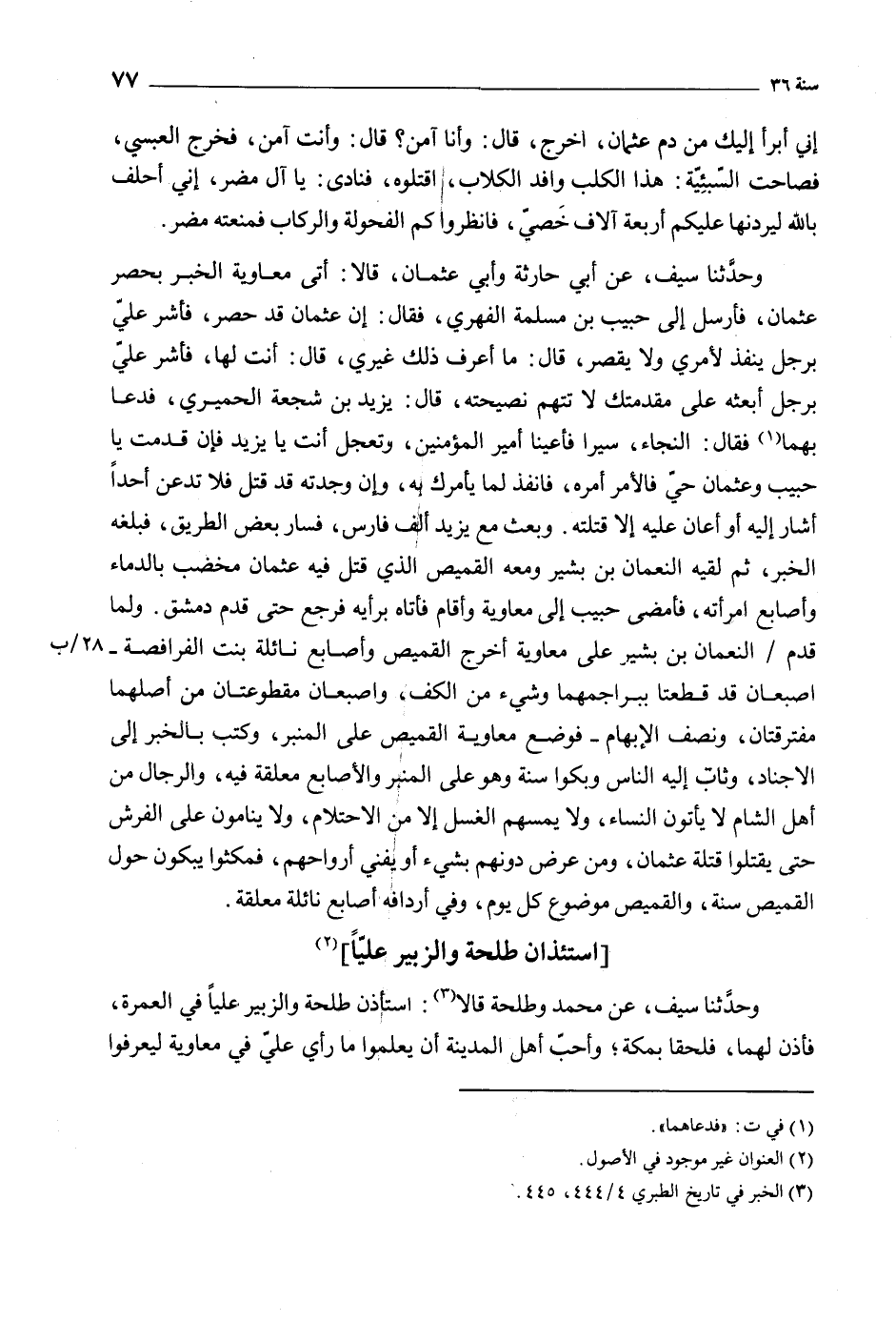 وحَدَّثَنَا سَيْفٌ، عَنْ مُحَمَّدٍ وَطَلْحَةَ قَالا [3] : اسْتَأْذَنَ طَلْحَةُ وَالزُّبَيْرُ عَلِيًّا فِي الْعُمْرَةِ، فَأَذِنَ لَهُمَا، فَلَحِقَا بِمَكَّةَ، وَأَحَبَّ أَهْلُ الْمَدِينَةِ أَنْ يَعْلَمُوا مَا رَأْيُ عَلِيٍّ فِي معاوية ليعرفوا
