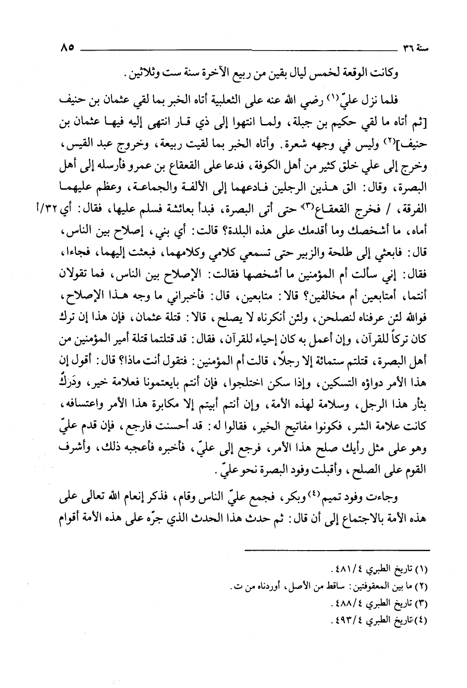فلما نزل علي [1] رضي الله عنه على الثعلبية أتاه الخبر بما لقي عثمان بن حنيف [ثم أتاه ما لقي حكيم بن جبلة، ولما انتهوا إلى ذي قار انتهى إليه فيها عثمان بن حنيف] [2] وليس فِي وجهه شعرة. وأتاه الخبر بما لقيت ربيعة، وخروج عبد القيس، وخرج إلى علي خلق كثير من أهل الكوفة، فدعا على القعقاع بن عمرو فأرسله إلى أهل البصرة، وقَالَ: الق هذين الرجلين فادعهما إلى الألفة والجماعة، وعظم عليهما الفرقة، / فخرج القعقاع [3] حتى أتى البصرة، فبدأ بعائشة فسلم عليها، فقال: أي 32/ أأماه، ما أشخصك وما أقدمك على هذه البلدة؟ قَالَتْ: أي بني، إصلاح بين الناس، قَالَ: فابعثي إلى طَلْحَة والزبير حتى تسمعي كلامي وكلامهما، فبعثت إليهما، فجاءا، فقَالَ: إني سألت أم المؤمنين ما أشخصها فقالت: الإصلاح بين الناس، فما تقولان أنتما، أمتابعين أم مخالفين؟ قالا: متابعين، قال: فأخبراني ما وجه هذا الإصلاح، فو الله لئن عرفناه لنصلحن، ولئن أنكرناه لا يصلح، قالا: قتلة عثمان، فإن هذا إن ترك كان تركا للقرآن، وإن أعمل به كان إحياء للقرآن، فقَالَ: قد قتلتما قتلة أمير المؤمنين من أهل البصرة، قتلتم ستمائة إلا رجلا، قالت أم المؤمنين: فتقول أنت ماذا؟ قَالَ: أقول إن هذا الأمر دواؤه التسكين، وإذا سكن اختلجوا، فإن أنتم بايعتمونا فعلامة خير، ودرك بثأر هذا الرجل، وسلامة لهذه الأمة، وإن أنتم أبيتم إلا مكابرة هذا الأمر واعتسافه، كانت علامة الشر، فكونوا مفاتيح الخير، فقالوا له: قد أحسنت فارجع، فإن قدم علي وهو على مثل رأيك صلح هذا الأمر، فرجع إلى علي، فأخبره فأعجبه ذلك، وأشرف القوم على الصلح، وأقبلت وفود البصرة نحو علي.