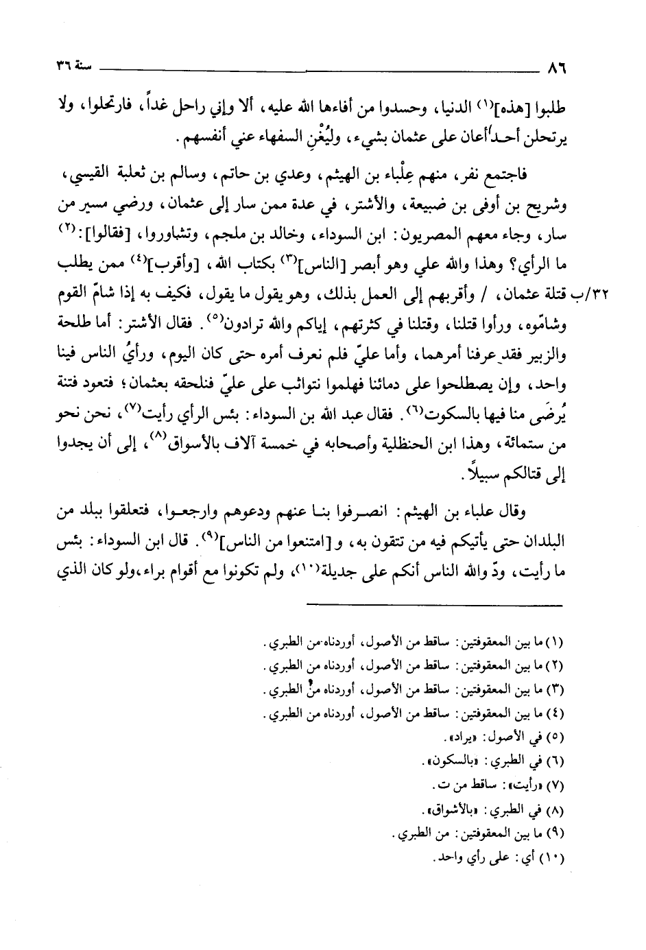 فاجتمع نفر، منهم علباء بن الهيثم، وعدي بن حاتم، وسالم بن ثعلبة القيسي، وشريح بن أوفى بن ضبيعة، والأشتر، فِي عدة ممن سار إلى عثمان، ورضي مسير من سار، وجاء معهم المصريون: ابن السوداء، وخالد بن ملجم، وتشاوروا، [فقالوا] : [2] ما الرأي؟ وهذا والله علي وهو أبصر [الناس] [3] بكتاب الله، [وأقرب] [4] ممن يطلب 32/ ب قتلة عثمان، / وأقربهم إلى العمل بذلك، وهو يقول ما يقول، فكيف به إذا شام القوم وشاموه، ورأوا قتلنا، وقتلنا فِي كثرتهم، إياكم والله ترادون [5] . فقَالَ الأشتر: أما طَلْحَة والزبير فقد عرفنا أمرهما، وأما علي فلم نعرف أمره حتى كان اليوم، ورأي الناس فينا واحد، وإن يصطلحوا على دمائنا فهلموا نتواثب على علي فنلحقه بعثمان، فتعود فتنة يرضى منا فيها بالسكوت [6] . فقَالَ عَبْد اللَّهِ بن السوداء: بئس الرأي رأيت [7] ، نحن نحو من ستمائة، وهذا ابن الحنظلية وأصحابه فِي خمسة آلاف بالأسواق [8] ، إلى أن يجدوا إلى قتالكم سبيلا.