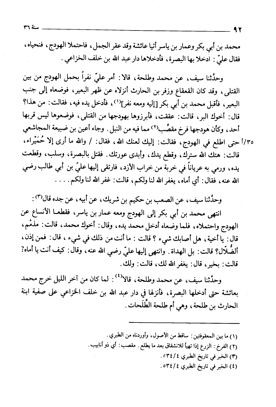 مُحَمَّدَ بْنَ أَبِي بَكْرٍ وَعَمَّارَ بْنَ يَاسِرٍ أَتَيَا عَائِشَةَ وَقَدْ عُقِرَ الْجَمَلُ، فَاحْتَمَلا الْهَوْدَجَ، فَنَحَّيَاهُ، فَقَالَ عَلِيٌّ: ادْخُلا بِهَا الْبَصْرَةَ، فَأَدْخِلاهَا دَارَ عَبْدِ اللَّهِ بْنِ خَلَفٍ الْخُزَاعِيِّ. وحَدَّثَنَا سَيْفٌ، عَنْ مُحَمَّدٍ وَطَلْحَةَ، قَالا: أَمَرَ عَلِيٌّ نَفَرًا بِحَمْلِ الْهَوْدَجِ مِنْ بَيْنَ الْقَتْلَى، وَقَدْ كَانَ الْقَعْقَاعُ وَزُفَرُ بْنُ الْحَارِثِ أَنْزَلاهُ عَنْ ظَهْرِ الْبَعِيرِ، فَوَضَعَاهُ إِلَى جَنْبِ الْبَعِيرِ، فَأَقْبَلَ محمد بن أبي بَكْرٍ [إِلَيْهِ وَمَعَهُ نَفَرٌ] [1] ، فَأَدْخَلَ يَدَهُ فِيهِ، فَقَالَتْ: مَنْ هَذَا؟