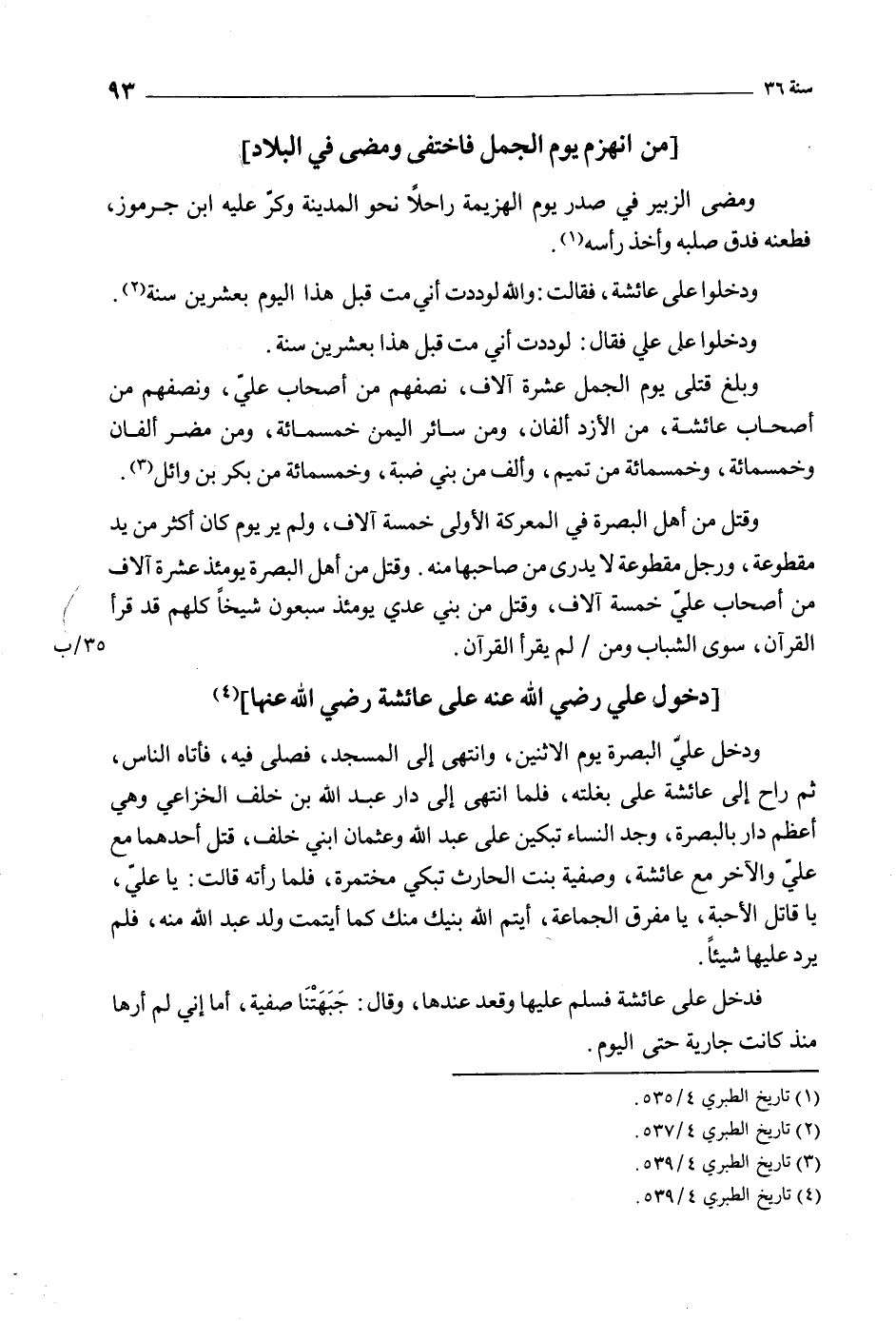 وقتل من أهل البصرة فِي المعركة الأولى خمسة آلاف، ولم ير يوم كان أكثر من يد مقطوعة، ورجل مقطوعة لا يدرى من صاحبها منه. وقتل من أهل البصرة يومئذ عشرة آلاف من أصحاب علي خمسة آلاف، وقتل من بني عدي يومئذ سبعون شيخا كلهم قد قرأ القرآن، سوى الشباب ومن/ لم يقرأ القرآن