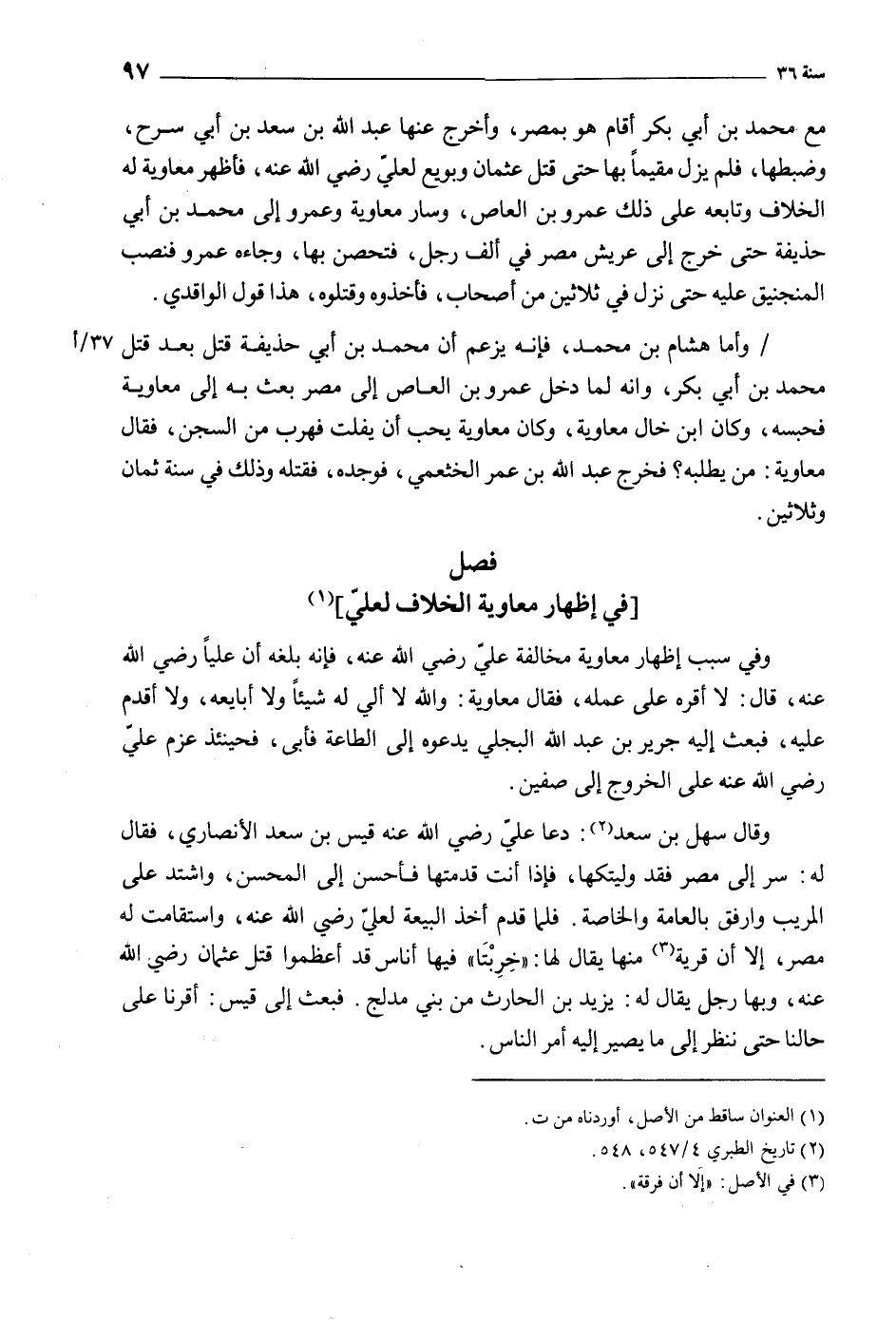 [1] وفِي سبب إظهار معاوية مخالفة علي رَضِيَ اللَّهُ عَنْهُ، فإنه بلغه أن عليا رَضِيَ اللَّهُ عَنْهُ، قَالَ: لا أقره على عمله، فقَالَ معاوية: والله لا ألي له شيئا ولا أبايعه، ولا أقدم عليه، فبعث إليه جرير بن عَبْد اللَّهِ البجلي يدعوه إلى الطاعة فأبى، فحينئذ عزم علي رضي الله عنه على الخروج إلى صفين. وقَالَ سهل بن سعد [2] : دعا علي رضي الله عنه قيس بن سعد الأنصاري، فقَالَ له: سر إلى مصر فقد وليتكها، فإذا أنت قدمتها فأحسن إلى المحسن، واشتد على المريب وارفق بالعامة والخاصة. فلما قدم أخذ البيعة لعلي رَضِيَ اللَّهُ عَنْهُ، واستقامت له مصر، إلا أن قرية [3] منها يقال لها: «خربتا» فيها أناس قد أعظموا قتل عثمان رَضِيَ اللَّهُ عَنْهُ، وبها رجل يقال له: يزيد بن الحارث من بني مدلج. فبعث إلى قيس: أقرنا على حالنا حتى ننظر إلى ما يصير إليه أمر الناس.