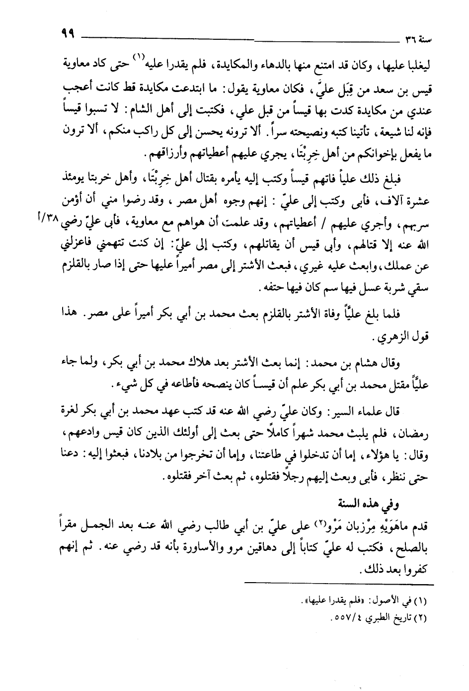 وفِي هذه السنة قدم ماهويه مرزبان مرو [2] على عَلي بْن أبي طالب رَضِيَ اللهُ عنه بعد الجمل مقرا بالصلح، فكتب له علي كتابا إلى دهاقين مرو والأساورة بأنه قد رضي عنه. ثم إنهم كفروا بعد ذلك.