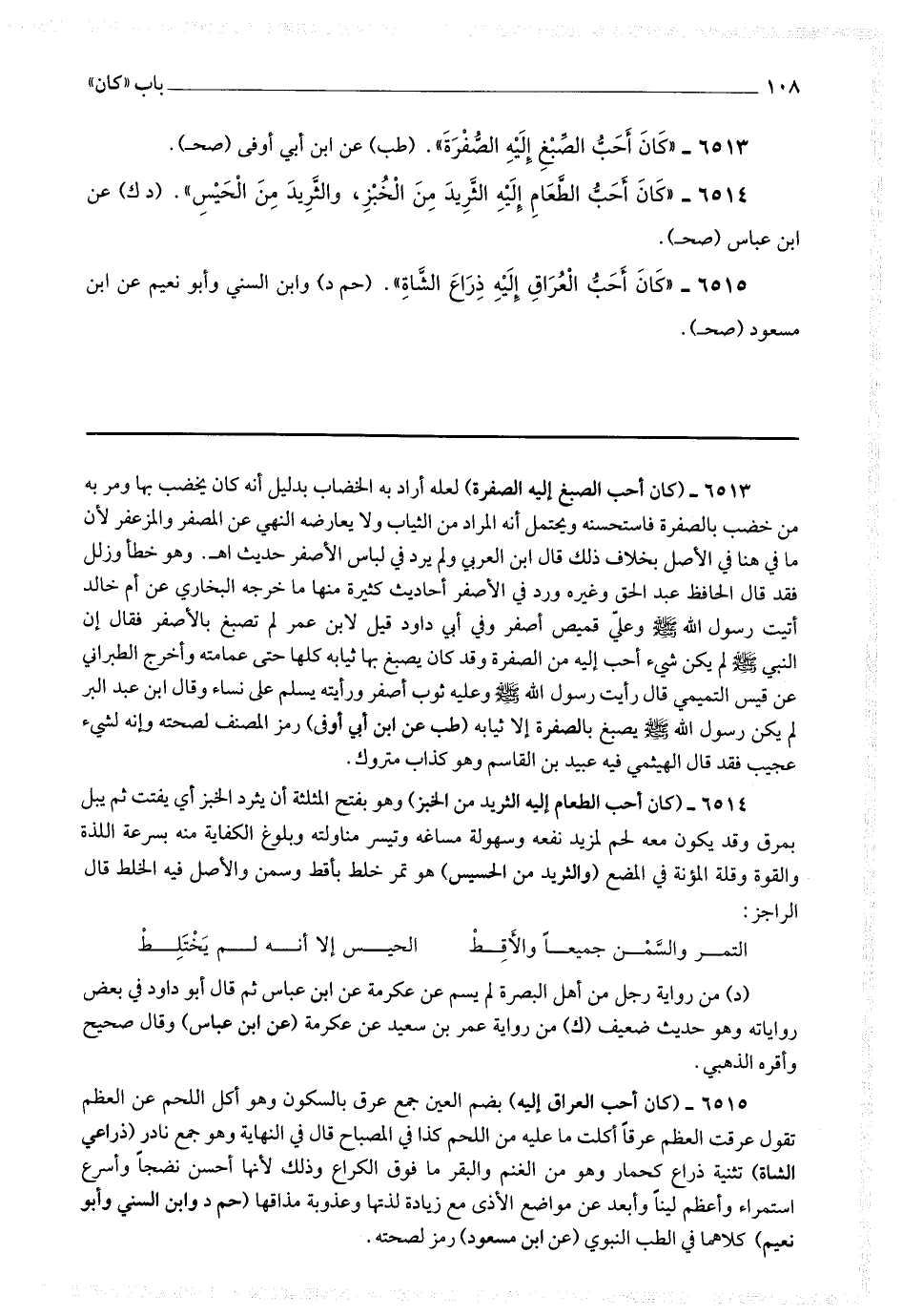 6513 - (كان أحب الصبغ إليه الصفرة) لعله أراد به الخضاب بدليل أنه كان يخضب بها ومر به من خضب بالصفرة فاستحسنه ويحتمل أنه المراد من الثياب ولا يعارضه النهي عن المصفر والمزعفر لأن ما في هنا في الأصل بخلاف ذلك قال ابن العربي : ولم يرد في لباس الأصفر حديث اه.