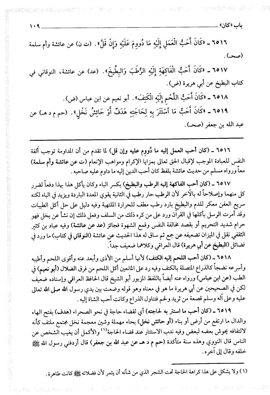 6518 - (كان أحب اللحم إليه الكتف) لأنها أسلم من الأذى وأبعد عنه وأقوى اللحم وأطيبه وأسرعه نضجا كالذراع المتصلة بالكتف وفيه رد على المانعين أكل اللحم من فرق الضلال.