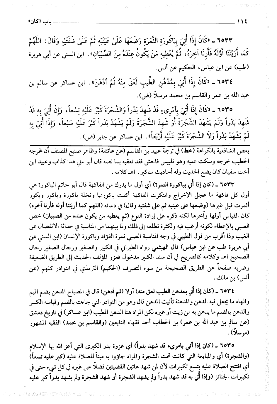 6535 - (كان إذا أتي بامرئ قد شهد بدرا) أي غزوة بدر الكبرى التي أعز الله بها الإسلام (والشجرة) أي والمبايعة [ ص 90 ] التي كانت تحت الشجرة والمراد جاؤوا به ميتا للصلاة عليه (كبر عليه تسعا) أي افتتح الصلاة عليه بتسع تكبيرات لأن لمن شهد هاتين القضيتين فضلا على غيره في كل شئ حتى في تكبيرات الجنائز (وإذا أتي به قد شهد بدرا ولم يشهد الشجرة أو شهد الشجرة ولم يشهد بدرا كبر عليه