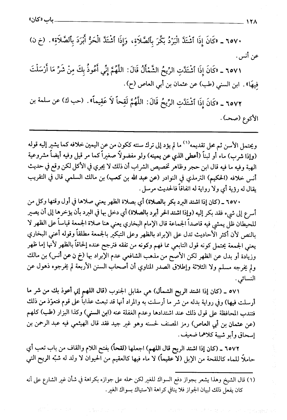 6570 - (كان إذا اشتد البرد بكر بالصلاة) أي بصلاة الظهر يعني صلاها في أول وقتها وكل من أسرع إلى شئ فقد بكر إليه (وإذا اشتد الحر أبرد بالصلاة) أي دخل بها في البرد بأن يؤخرها إلى أن يصير للحيطان ظل يمشي فيه قاصدا الجماعة قال الإمام البخاري : يعني هنا صلاة الجمعة قياسا على الظهر لا بالنص لأن أكثر الأحاديث تدل على الإبراد بالظهر وعلى التبكير بالجمعة مطلقا وقوله أعني البخاري