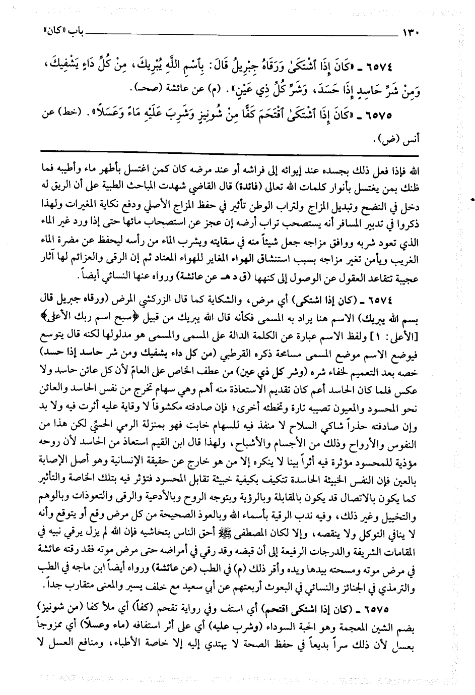 6574 - (كان إذا اشتكى) أي مرض، والشكاية كما قال الزركشي المرض (ورقاه جبريل قال بسم الله يبريك) الاسم هنا يراد به المسمى فكأنه قال الله يبريك من قبيل * (سبح اسم ربك الأعلى) * [الاعلى: 1] ولفظ الاسم عبارة عن الكلمة الدالة على المسمى والمسمى هو مدلولها لكنه قال: يتوسع فيوضع الاسم موضع المسمى مسامحة ذكره القرطبي (من كل داء يشفيك ومن شر حاسد إذا حسد) خصه بعد التعميم لخفاء شره (وشر كل ذي عين) من عطف الخاص على العام لأن كل عائن حاسد ولا عكس فلما كان الحاسد أعم كان تقديم الاستعاذة منه أهم وهي سهام تخرج من نفس الحاسد والعائن نحو المحسود والمعيون تصيبه تارة وتخطئه أخرى، فإن صادفته مكشوفا لا وقاية عليه أثرت فيه ولا بد وإن صادفته حذرا شاكي السلاح لا منفذ فيه للسهام خابت فهو بمنزلة الرمي الحسي لكن هذا من النفوس والأرواح وذلك من الأجسام والأشباح، ولهذا قال ابن القيم: استعاذ من الحاسد لأن روحه مؤذية للمحسود مؤثرة فيه أثرا بينا لا ينكره إلا من هو خارج عن حقيقة الإنسانية وهو أصل الإصابة بالعين فإن النفس الخبيثة الحاسدة تتكيف بكيفية خبيثة تقابل المحسود فتؤثر فيه بتلك الخاصة والتأثير كما يكون بالاتصال قد يكون بالمقابلة وبالرؤية وبتوجه الروح وبالأدعية والرقى والتعوذات وبالوهم والتخييل وغير ذلك، وفيه ندب الرقية بأسماء الله وبالعوذ الصحيحة من كل مرض وقع أو يتوقع وأنه لا ينافي التوكل ولا ينقصه، وإلا لكان المصطفى صلى الله عليه وسلم أحق الناس بتحاشيه فإن الله لم يزل يرقى نبيه في المقامات الشريفة والدرجات الرفيعة إلى أن قبضه وقد رقى في أمراضه حتى مرض موته فقد رقته عائشة في مرض موته ومسحته بيدها ويده وأقر ذلك.