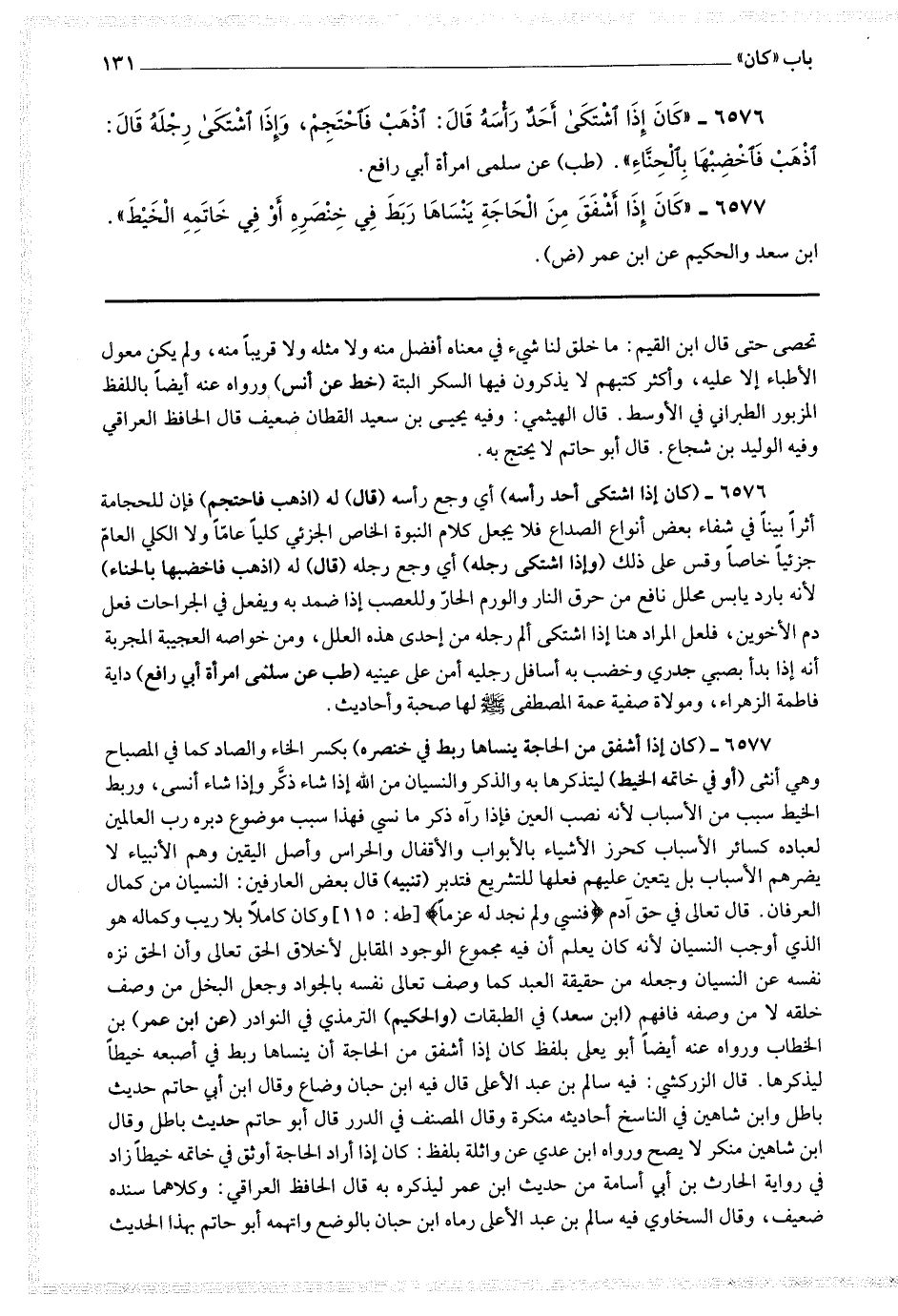 [ ص 103 ] 6576 - (كان إذا اشتكى أحد رأسه) أي وجع رأسه (قال) له (اذهب فاحتجم) فإن للحجامة أثرا بينا في شفاء بعض أنواع الصداع فلا يجعل كلام النبوة الخاص الجزئي كليا عاما ولا الكلي العام جزئيا خاصا وقس على ذلك (وإذا اشتكى رجله) أي وجع رجله (قال) له (اذهب فاخضبها بالحناء) لأنه بارد يابس محلل نافع من حرق النار والورم الحار وللعصب إذا ضمد به ويفعل في الجراحات فعل دم الأخوين ، فلعل المراد هنا إذا اشتكى ألم رجله من إحدى هذه العلل ، ومن خواصه العجيبة المجربة أنه إذا بدأ بصبي جدري وخضب به أسافل رجليه أمن على عينيه.