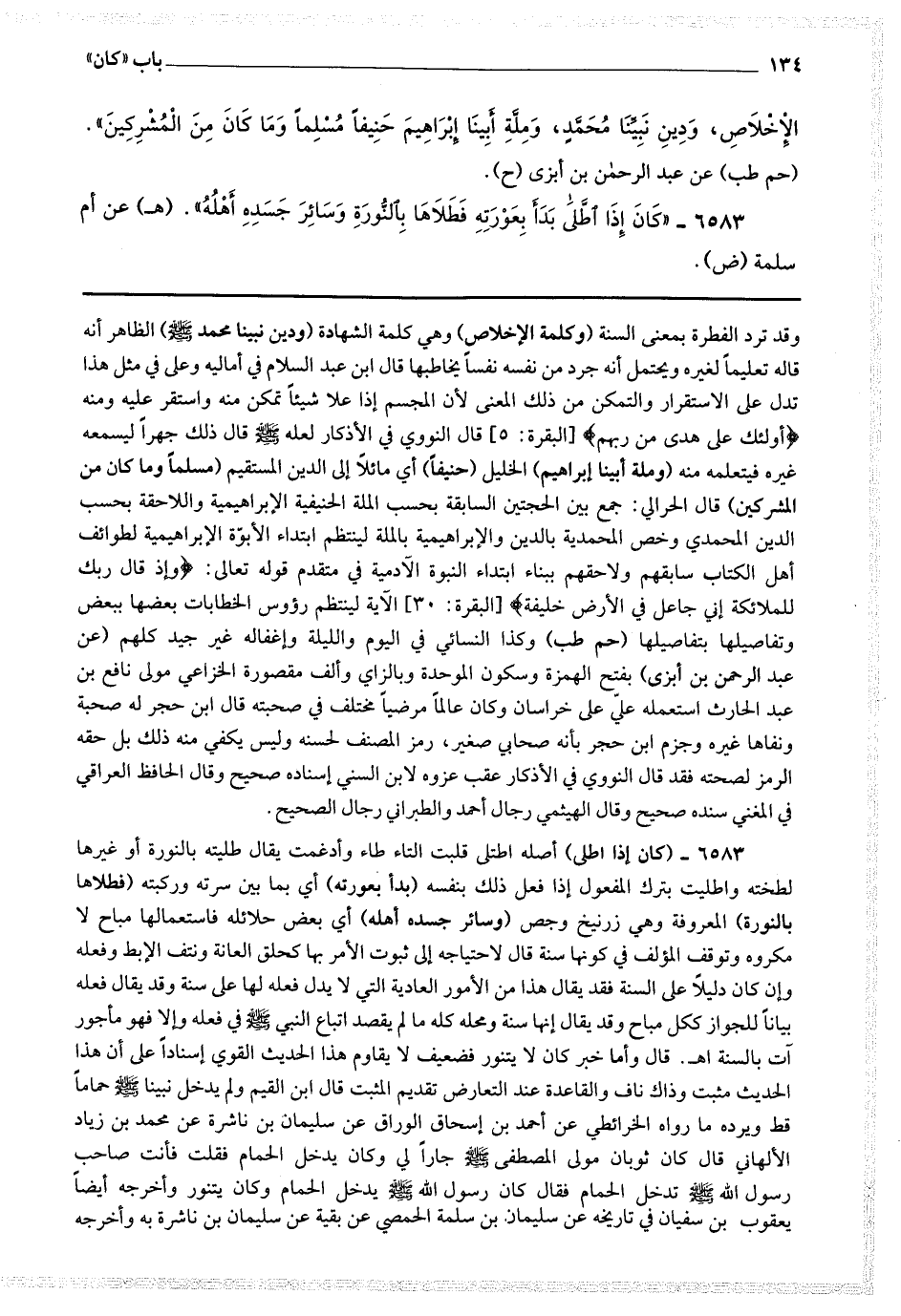 6583 - (كان إذا اطلى) أصله اطتلي قلبت التاء طاء وأدغمت يقال طليته بالنورة أو غيرها لطخته واطليت بترك المفعول إذا فعل ذلك بنفسه (بدأ بعورته) أي بما بين سرته وركبته (فطلاها بالنورة) المعروفة وهي زرنيخ وجص (وسائر جسده أهله) أي بعض حلائله فاستعمالها مباح لا مكروه وتوقف المؤلف في كونها سنة قال : لاحتياجه إلى ثبوت الأمر بها كحلق العانة ونتف الإبط وفعله وإن كان دليلا على السنة فقد يقال هذا من الأمور العادية التي لا يدل فعله لها على سنة وقد يقال فعله بيانا للجواز ككل مباح وقد يقال إنها سنة ومحله كله ما لم يقصد اتباع النبي صلى الله عليه وسلم في فعله وإلا فهو مأجور آت بالسنة اه.