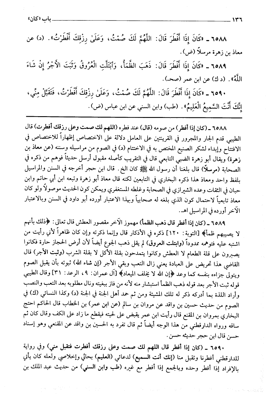 6589 - (كان إذا أفطر قال ذهب الظمأ) مهموز الآخر مقصور العطش قال تعالى * (ذلك بأنهم لا يصبهم ظمأ) * ذكره في الأذكار قال : وإنما ذكرته وإن كان ظاهرا لأني رأيت من اشتبه عليه فتوهمه ممدودا (وابتلت العروق) لم يقل ذهب الجوع أيضا لأن أرض الحجاز حارة فكانوا يصبرون على قلة الطعام لا العطش وكانوا يمتدحون بقلة الأكل لا بقلة الشرب (ثبت الآجر) قال القاضي : هذا تحريض على العبادة يعني زال التعب وبقي الأجر (إن شاء الله) ثبوته بأن يقبل الصوم ويتولى جزاءه بنفسه كما وعد * (إن الله لا يخلف الميعاد) * وقال الطيبي : قوله ثبت الأجر بعد قوله ذهب الظمأ استبشار منه لأنه من فاز ببغيته ونال مطلوبه بعد التعب والنصب وأراد اللذة بما أدركه ذكر له تلك المشقة ومن ثم حمد أهل الجنة في الجنة.