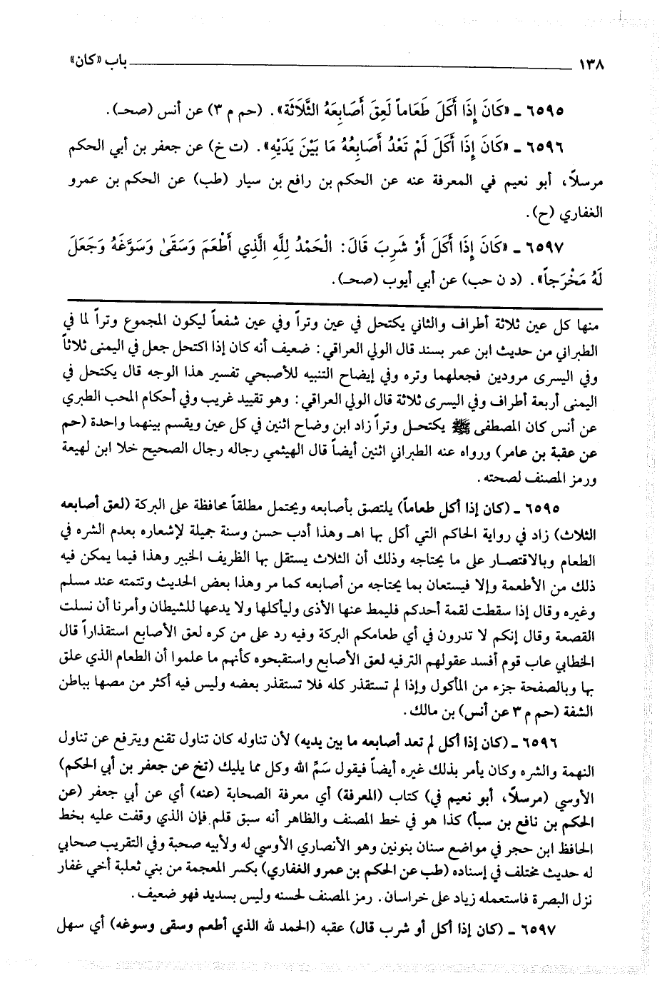 6596 - (كان إذا أكل لم تعد أصابعه ما بين يديه) لأن تناوله كان تناول تقنع ويترفع عن تناول النهمة والشره [ ص 109 ] وكان يأمر بذلك غيره أيضا فيقول سم الله وكل مما يليك.