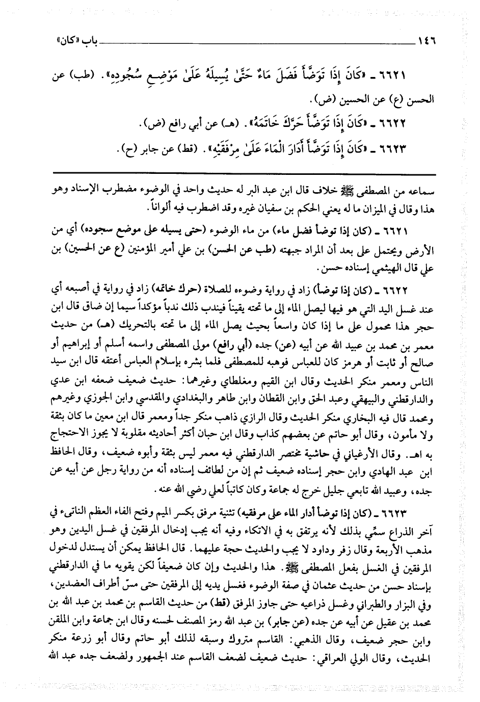 6623 - (كان إذا توضأ أدار الماء على مرفقيه) تثنية مرفق بكسر الميم وفتح الفاء العظم الناتئ في آخر الذراع مسي بذلك لأنه يرتفق به في الاتكاء وفيه أنه يجب إدخال المرفقين في غسل اليدين وهو مذهب الأربعة وقال زفر وداود : لا يجب والحديث حجة عليهما.