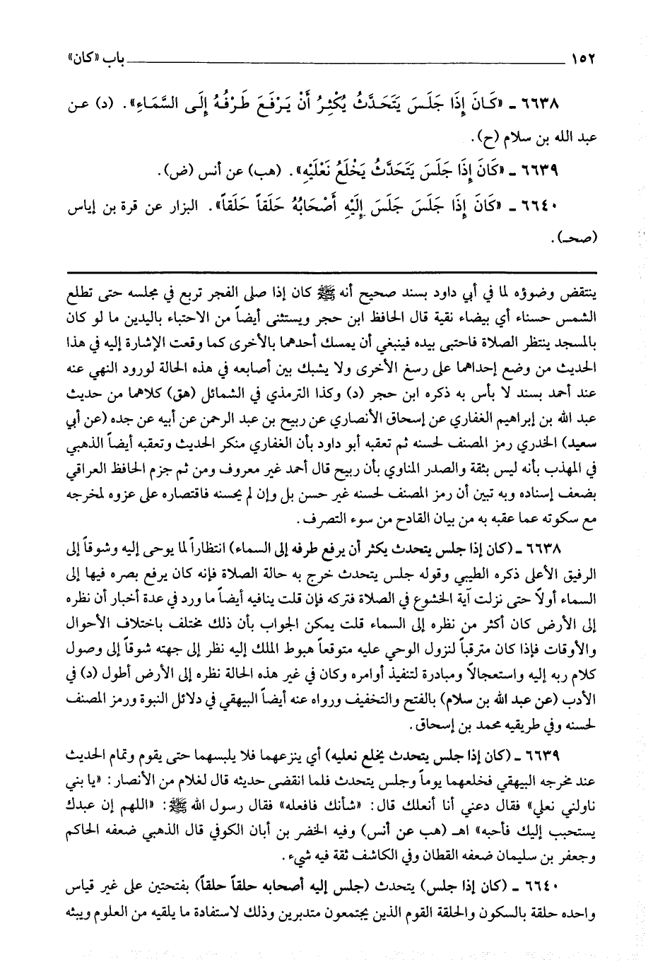 - (د) وكذا الترمذي في الشمائل (هق) كلاهما من حديث عبد الله بن إبراهيم الغفاري عن إسحاق الأنصاري عن ربيح بن عبد الرحمن عن أبيه عن جده (عن أبي سعيد) الخدري رمز المصنف لحسنه ثم تعقبه أبو داود بأن الغفاري منكر الحديث وتعقبه أيضا الذهبي في المهذب بأنه ليس بثقة والصدر المناوي بأن ربيح قال أحمد غير معروف ومن ثم جزم الحافظ العراقي بضعف إسناده وبه تبين أن رمز المصنف لحسنه غير حسن بل وإن لم يحسنه فاقتصاره على عزوه لمخرجه مع سكوته عما عقبه به من بيان الفادح من سوء التصرف.