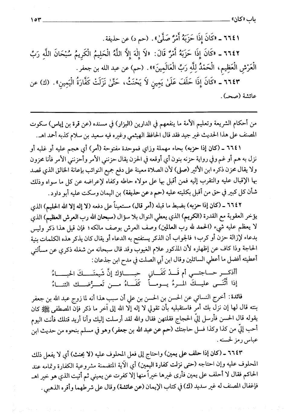 6642 - (كان إذا حزبه) بضبط ما قبله (أمر قال) مستعينا على دفعه (لا إله إلا الله الحليم) الذي يؤخر العقوبة مع القدرة (الكريم) الذي يعطي النوال بلا سؤال (سبحان الله رب العرش العظيم) الذي لا يعظم عليه شئ (الحمد لله رب العالمين) وصف العرش بوصف مالكه ، فإن قيل هذا ذكر وليس بدعاء لإزالة حزن أو كرب ، فالجواب أن الذكر يستفتح به الدعاء أو يقال كان يذكر هذه الكلمات بنية الحاجة وذا كاف عن إظهاره لأن المذكور علام الغيوب وقد قال سبحانه من شغله ذكري عن مسألتي أعطيته أفضل ما أعطي السائلين وقال ابن أبي الصلت في مدح ابن جذعان : أأذكر حاجتي أم قد كفاني * حباؤك إن شيمتك الحباء إذا أثنى عليك المرء يوما * كفاه من تعرضك الثناء فائدة : أخرج النسائي عن الحسن بن الحسن بن علي أن سبب هذا أنه لما زوج عبد الله بن جعفر بنته قال لها : إن نزل بك أمر فاستقبليه بأن تقولي لا إله إلا الله إلى آخر ما ذكر فإن المصطفى صلى الله عليه وسلم كان يقوله قال الحسن : فأرسل إلي الحجاج فقلتهن فقال : والله لقد أرسلت إليك وأنا أريد قتلك فأنت اليوم أحب إلي من كذا وكذا فسل حاجتك.
