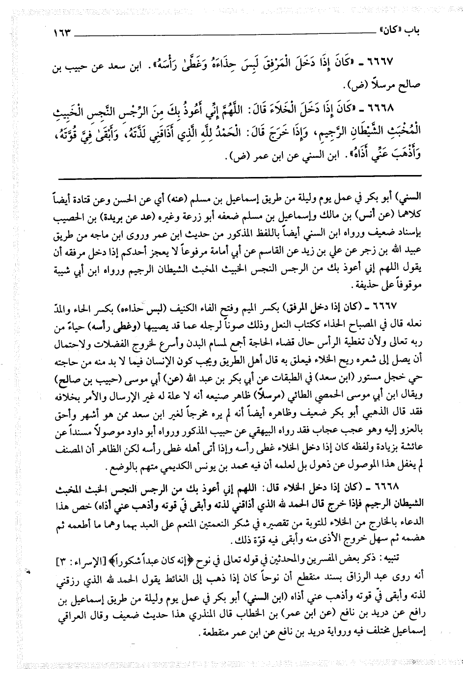 تنبيه : ذكر بعض المفسرين والمحدثين في قوله تعالى في نوح * (إنه كان عبدا شكورا) * أنه روى عبد الرزاق بسند منقطع أن نوحا كان إذا ذهب إلى الغائط يقول الحمد لله الذي رزقني لذته وأبقى في قوته وأذهب عني أذاه.