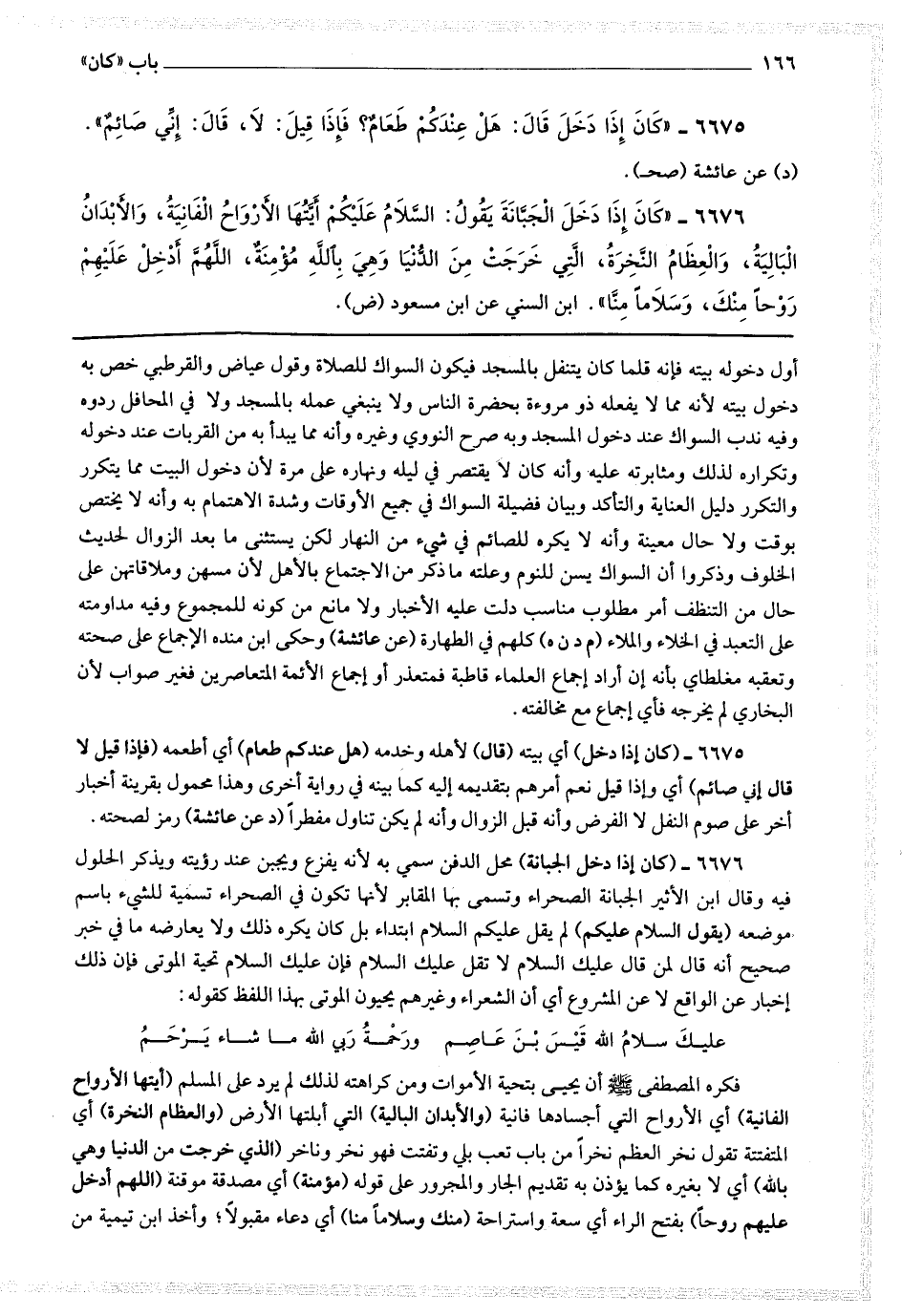 6676 - (كان إذا دخل الجبانة) محل الدفن سمي به لأنه يفزع ويجبن عند رؤيته ويذكر الحلول فيه وقال ابن الأثير : الجبانة الصحراء وتسمى بها المقابر لأنها تكون في الصحراء تسمية للشئ باسم موضعه (يقول السلام عليكم) لم يقل عليكم السلام ابتداء بل كان يكره ذلك ولا يعارضه ما في خبر صحيح أنه قال لمن قال عليك السلام لا تقل عليك السلام فإن عليك السلام تحية الموتى فإن ذلك إخبار عن الواقع لا عن المشروع أي أن الشعراء وغيرهم يحيون الموتى بهذا اللفظ كقوله : [ ص 131 ] عليك سلام الله قيس بن عاصم * ورحمة ربي الله ما شاء يرحم فكره المصطفى صلى الله عليه وسلم أن يحيي بتحية الأموات ومن كراهته لذلك لم يرد على المسلم (أيتها الأرواح الفانية) أي الأرواح التي أجسادها فانية (والأبدان البالية) التي أبلتها الأرض (والعظام النخرة) أي المتفتتة تقول نخر العظم نخرا من باب تعب بلى وتفتت فهو نخر وناخر (الذي خرجت من الدنيا وهي