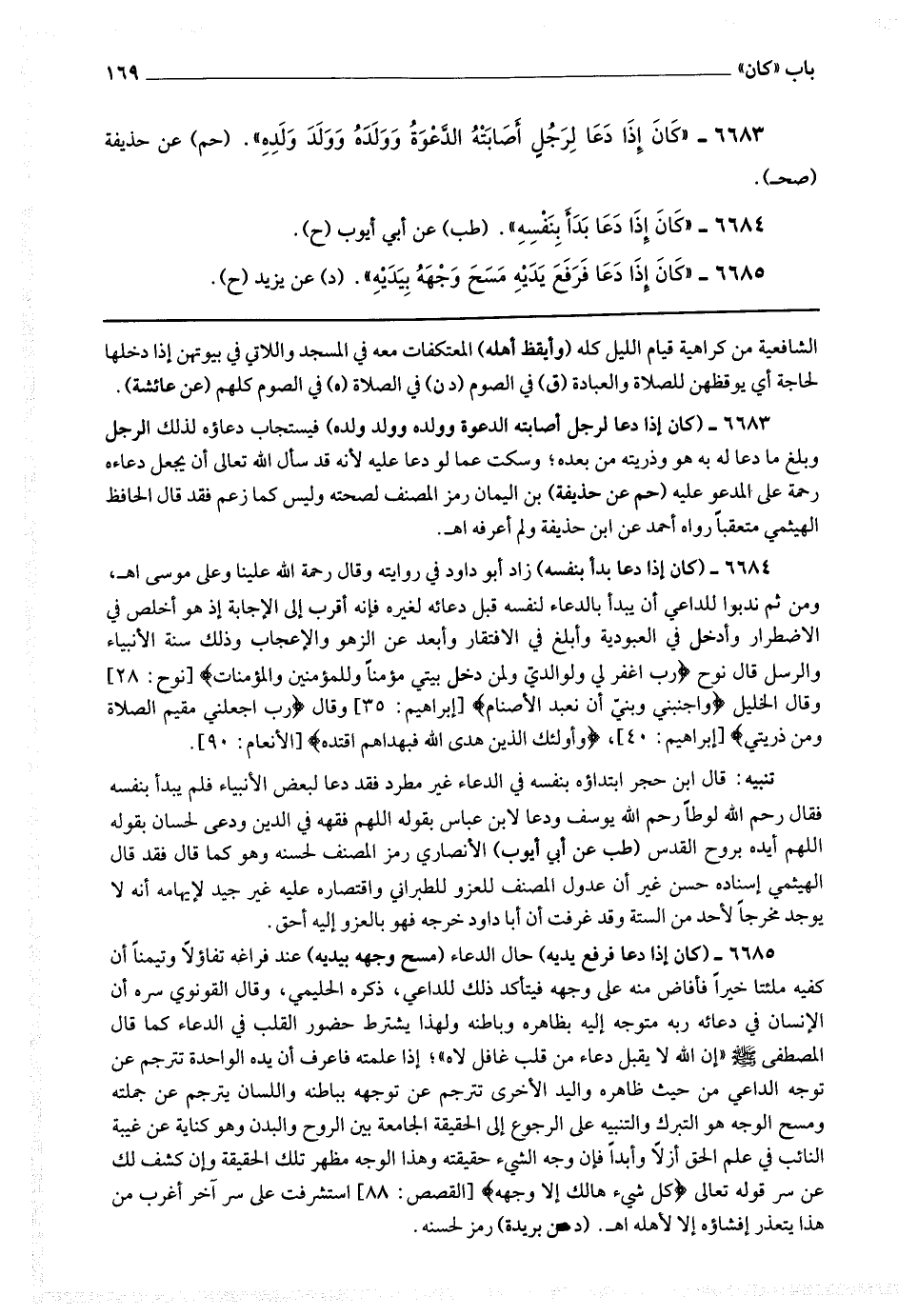 6685 - (كان إذا دعا فرفع يديه) حال الدعاء (مسح وجهه بيديه) عند فراغه تفاؤلا وتيمنا أن كفيه ملئتا خيرا فأفاض منه على وجهه فيتأكد ذلك للداعي ، ذكره الحليمي ، وقال القونوي : سره أن الإنسان في دعائه ربه متوجه إليه بظاهره وباطنه ولهذا يشترط حضور القلب في الدعاء كما قال المصطفى صلى الله عليه وسلم إن الله لا يقبل دعاءا من قلب غافل لاه ، إذا علمته فاعرف أن يده الواحدة تترجم عن توجه الداعي من حيث ظاهره واليد الأخرى تترجم عن توجهه بباطنه واللسان يترجم عن جملته ومسح الوجه هو التبرك والتنبيه على الرجوع إلى الحقيقة الجامعة بين الروح والبدن وهو كناية عن غيبة النائب في علم الحق أزلا وأبدا فإن وجه الشئ حقيقته وهذا الوجه مظهر تلك الحقيقة وإن كشف لك عن سر قوله تعالى * (كل شئ هالك إلا وجهه) * استشرفت على سر آخر أغرب من هذا يتعذر إفشاؤه إلا لأهله اه.