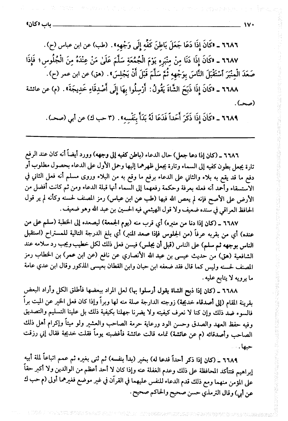 6688 - (كان إذا ذبح الشاة يقول أرسلوا بها) لعل المراد ببعضها فأطلق الكل وأراد البعض بقرينة المقام (إلى أصدقاء [ ص 134 ] خديجة) زوجته الدارجة صلة منه لها وبرا وإذا كان فعل الخير عن الميت برا فالسوء ضد ذلك وإن كنا لا نعرف كيفيته ولا يضرنا جهلنا بكيفية ذلك بل علينا التسليم والتصديق وفيه حفظ العهد والصدق وحسن الود ورعاية حرمة الصاحب والعشير ولو ميتا وإكرام أهل ذلك الصاحب وأصدقائه.