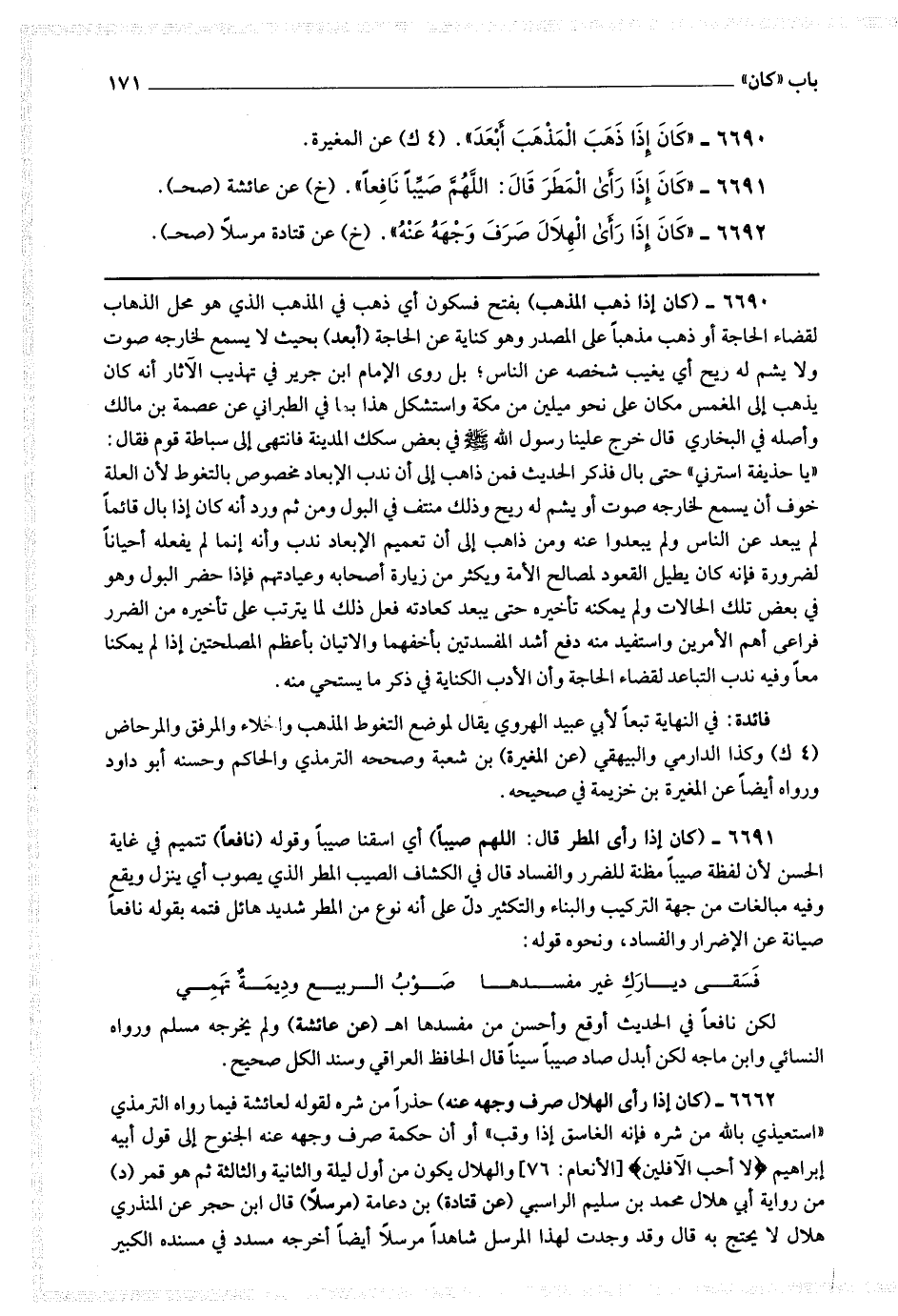 6690 - (كان إذا ذهب المذهب) بفتح فسكون أي ذهب في المذهب الذي هو محل الذهاب لقضاء الحاجة أو ذهب مذهبا على المصدر وهو كناية عن الحاجة (أبعد) بحيث لا يسمع لخارجه صوت ولا يشم له ريح أي يغيب شخصه عن الناس ، بل روى الإمام ابن جرير في تهذيب الآثار أنه كان يذهب إلى المغمس مكان على نحو ميلين من مكة واستشكل هذا بما في الطبراني عن عصمة بن مالك وأصله في البخاري قال : خرج علينا رسول الله صلى الله عليه وسلم في بعض سكك المدينة فانتهى إلى سباطة قوم فقال : " يا حذيفة استرني حتى بال فذكر الحديث فمن ذاهب إلى أن ندب الإبعاد مخصوص بالتغوط لأن العلة خوف أن يسمع لخارجه صوت أو يشم له ريح وذلك منتف في البول ومن ثم ورد أنه كان إذا بال قائما لم يبعد عن الناس ولم يبعدوا عنه ومن ذاهب إلى أن تعميم الإبعاد ندب وأنه إنما لم يفعله أحيانا لضرورة فإنه كان يطيل القعود لمصالح الأمة ويكثر من زيارة أصحابه وعيادتهم فإذا حضر البول وهو في بعض تلك الحالات ولم يمكنه تأخيره حتى يبعد كعادته فعل ذلك لما يترتب على تأخيره من الضرر