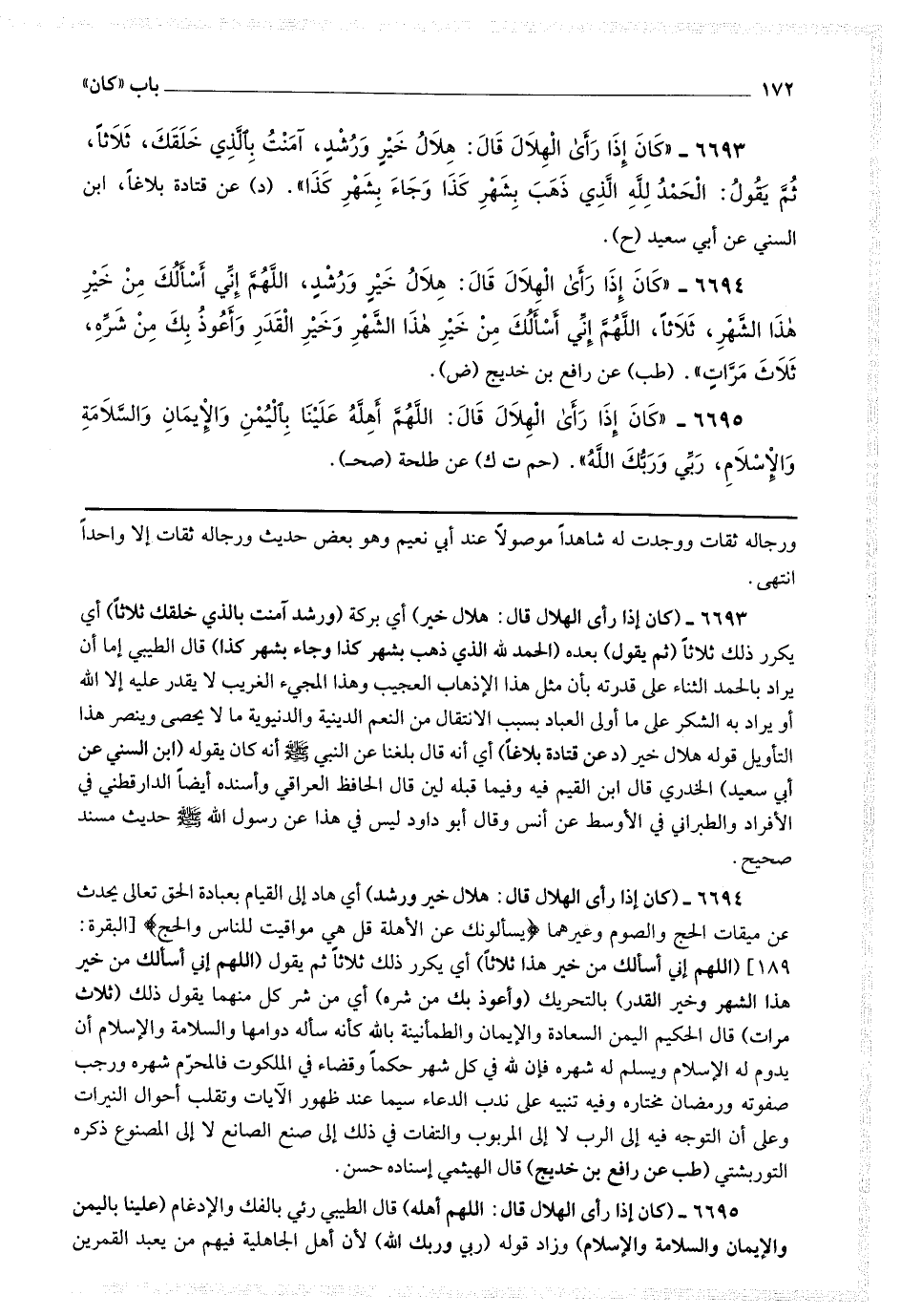 6695 - (كان إذا رأى الهلال قال اللهم أهله) قال الطيبي : روي بالفك والإدغام (علينا باليمن والإيمان والسلام والإسلام) وزاد قوله (ربي وربك الله) لأن أهل الجاهلية فيهم من يعبد القمرين