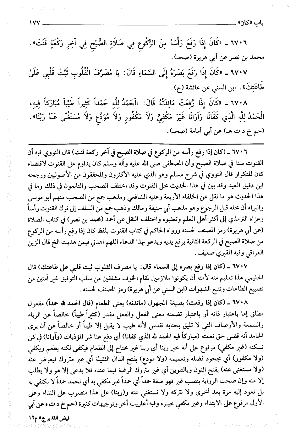 6706 - (كان إذا رفع رأسه من الركوع في صلاة الصبح في آخر ركعة قنت) قال النووي : فيه أن القنوت سنة في صلاة الصبح وأن المصطفى صلى الله عليه وآله وسلم كان يداوم على القنوت لاقتضاء كان للتكرار قال النووي في شرح مسلم : وهو الذي عليه الكثيرون والمحققون من الأصوليين ورجحه ابن دقيق العيد وقد بين في هذا الحديث محل القنوت وقد اختلف الصحب والتابعون في ذلك وما في هذا الحديث هو ما نقل عن الخلفاء الأربعة وعليه الشافعي ومذهب جمع من الصحب منهم أبو موسى والبراء أن محله قبل الرجوع وهو مذهب أبي حنيفة ومالك وذهب جمع من السلف إلى ترك القنوت رأسا وعزاه الترمذي إلى أكثر أهل العلم وتعقبوه واختلف النقل عن أحمد.