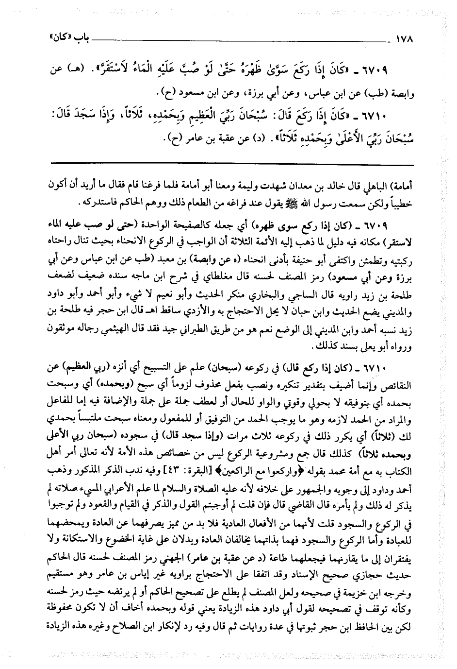 6709 - (كان إذا ركع سوى ظهره) أي جعله كالصفيحة الواحدة (حتى لو صب عليه الماء لاستقر) مكانه فيه دليل [ ص 140 ] لما ذهب إليه الأئمة الثلاثة أن الواجب في الركوع الانحناء بحيث تنال راحتاه ركبتيه وتطمئن واكتفى أبو حنيفة بأدنى انحناء.