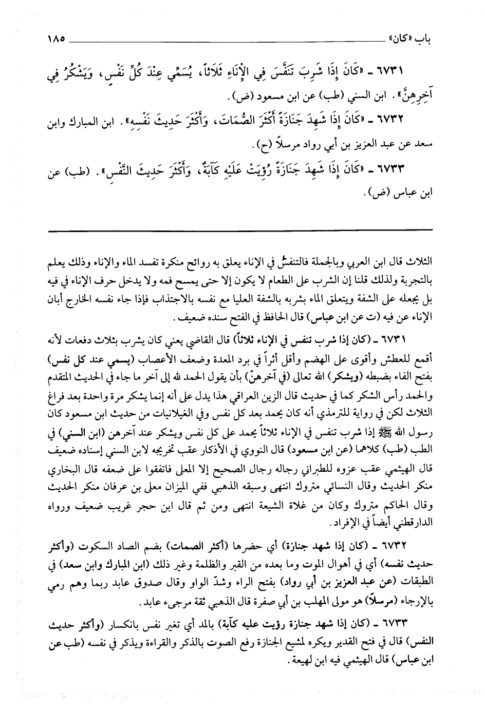 - (ابن السني) في الطب (طب) كلاهما (عن ابن مسعود) قال النووي في الأذكار عقب تخريجه لابن السني: إسناده ضعيف قال الهيثمي عقب عزوه للطبراني: رجاله رجال الصحيح إلا المعلى فاتفقوا على ضعفه قال البخاري: منكر الحديث وقال النسائي: متروك انتهى.