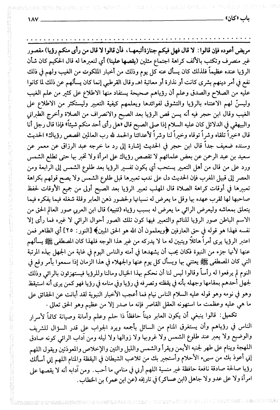 تكميل : قالوا : ينبغي أن يكون العابر دينا حافظا ذا حلم وعلم وأمانة وصيانة كاتما لأسرار الناس في رؤياهم وأن يستغرق المنام من السائل بأجمعه ويرد الجواب على قدر السؤال للشريف والوضيع ولا يعبر عند طلوع الشمس ولا غروبها ولا زوالها ولا ليله ومن آداب الرائي كونه صادق اللهجة وينام على طهر لجنبه الأيمن ويقرأ والشمس والليل والتين والإخلاص والمعوذتين ويقول اللهم