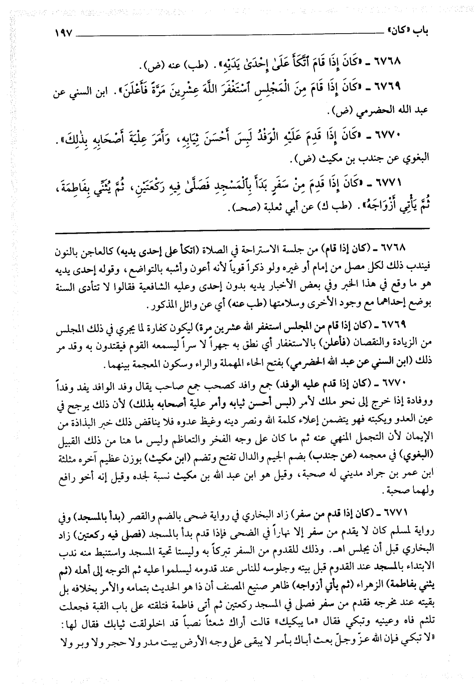 6771 - (كان إذا قدم من سفر) زاد البخاري في رواية ضحى بالضم والقصر (بدأ بالمسجد) وفي رواية لمسلم كان لا يقدم من سفر إلا نهارا في الضحى فإذا قدم بدأ بالمسجد (فصلى فيه ركعتين) زاد البخاري قبل أن يجلس اه.