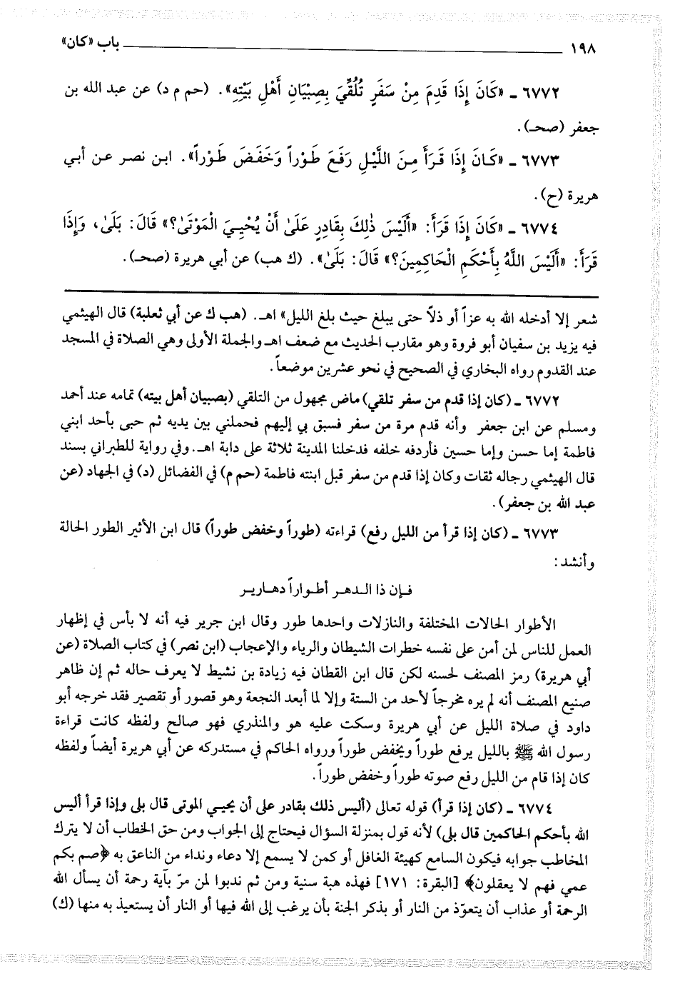 6774 - (كان إذا قرأ) قوله تعالى (أليس ذلك بقادر على أن يحيي الموتى قال بلى وإذا قرأ أليس الله بأحكم الحاكمين قال بلى) لأنه قول بمنزلة السؤال فيحتاج إلى الجواب ومن حق الخطاب أن لا يترك المخاطب جوابه فيكون السامع كهيئة الغافل أو كمن لا يسمع إلا دعاء ونداء من الناعق به * (صم بكم عمي فهم لا يعقلون) * فهذه هبة سنية ومن ثم ندبوا لمن مر بآية رحمة أن يسأل الله الرحمة أو عذاب أن يتعوذ من النار أو يذكر الجنة بأن يرغب إلى الله فيها أو النار أن يستعيذ به منها.