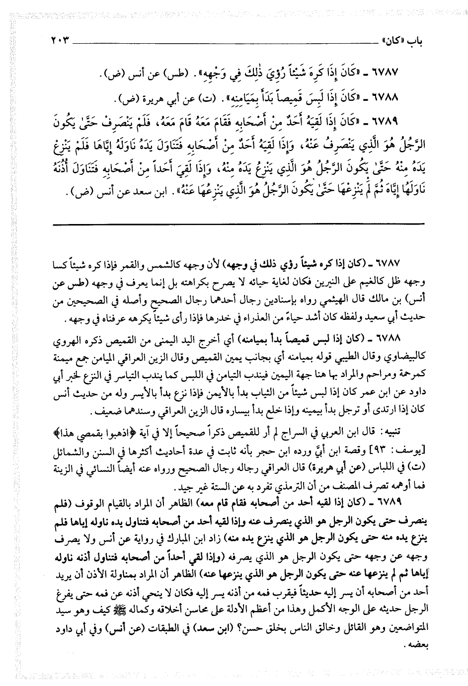 6788 - (كان إذا لبس قميصا بدأ بميامنه) أي أخرج اليد اليمنى من القميص ذكره الهروي كالبيضاوي وقال الطيبي : قوله بميامنه أي بجانب يمين القميص.