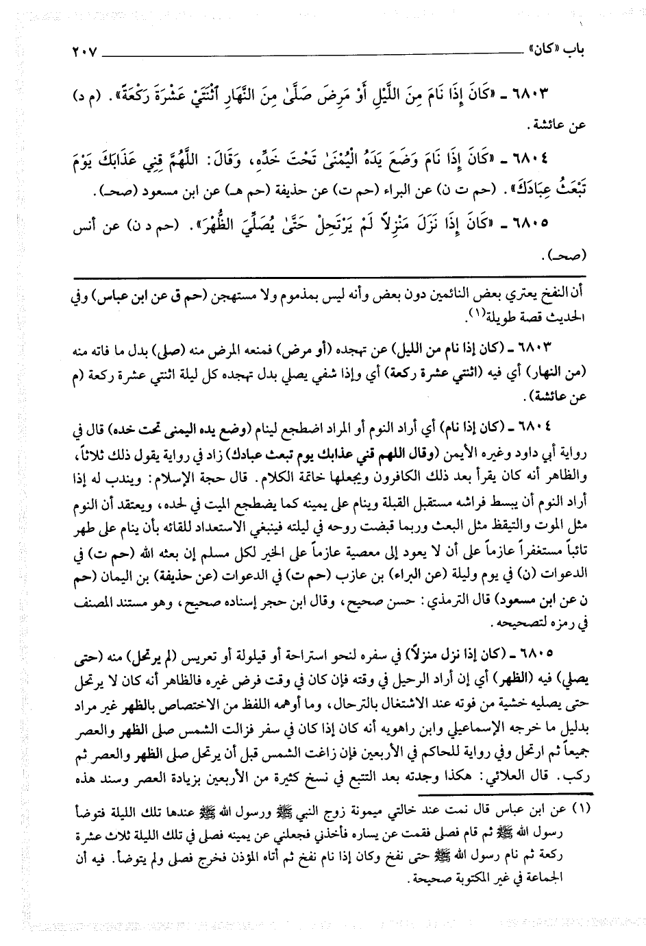 6804 - (كان إذا نام) أي أراد النوم أو المراد اضطجع لينام (وضع يده اليمنى تحت خده) قال : في رواية أبي داود وغيره الأيمن (وقال اللهم قني عذابك يوم تبعث عبادك) زاد في رواية يقول ذلك ثلاثا ، والظاهر أنه كان يقرأ بعد ذلك الكافرون ويجعلها خاتمة الكلام.